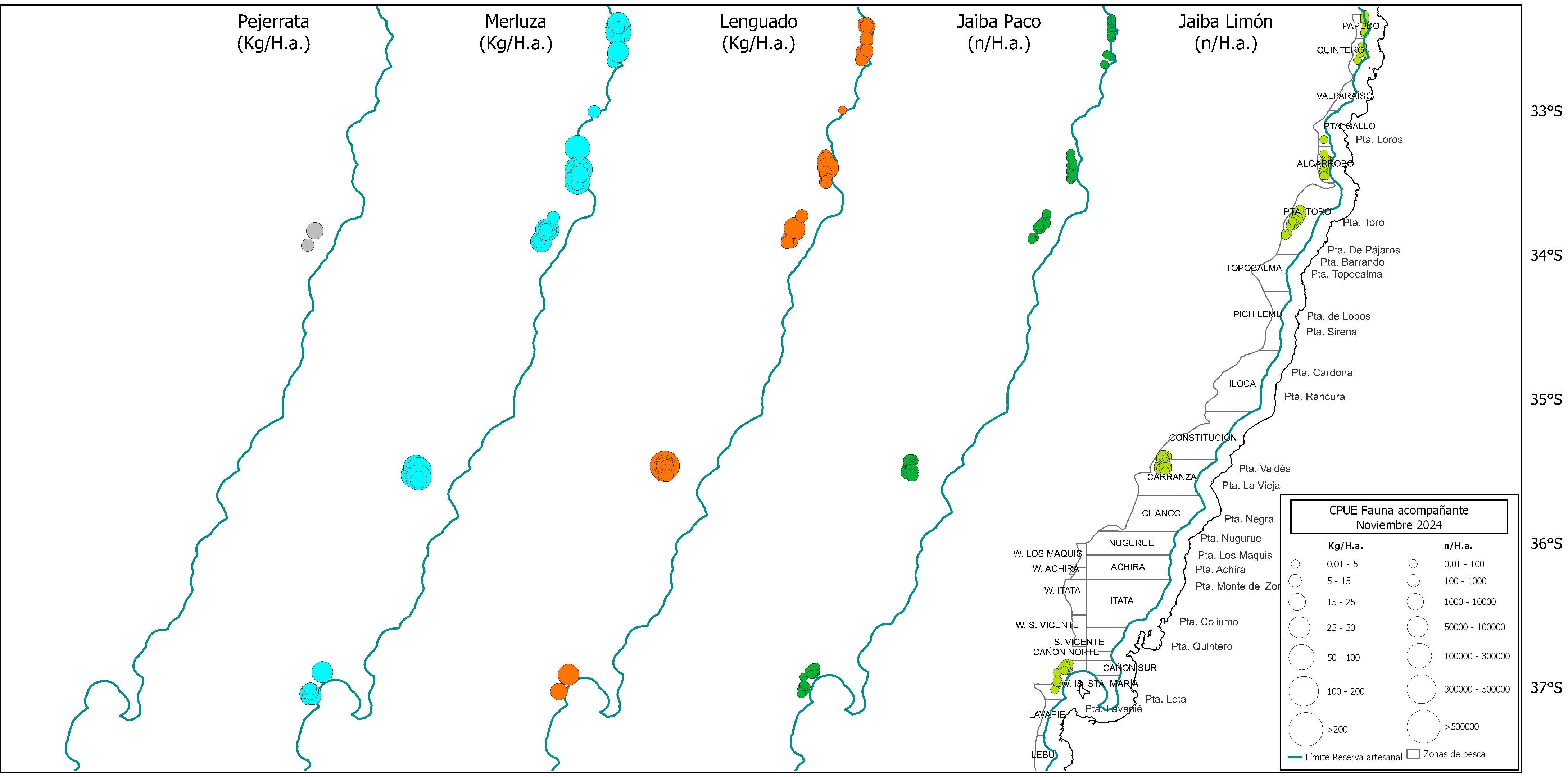 Las operaciones de pesca realizadas durante noviembre cubrieron los caladeros ubicados desde la región del Biobío a la región de Valparaíso, destacando los caladeros de Papudo, Quintero, Algarrobo, Punta Toro, Carranza y la Isla Santa María (Fig. 1).