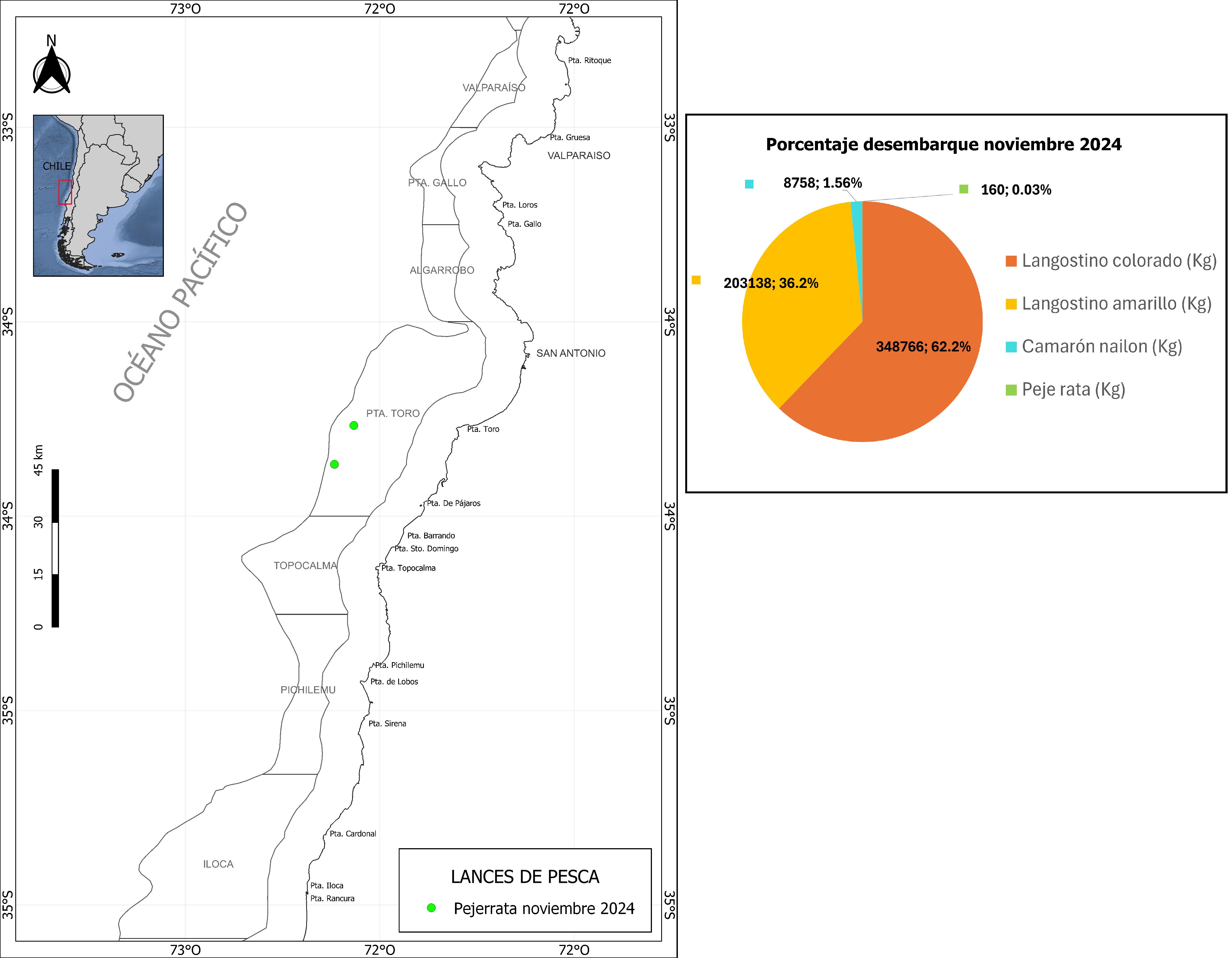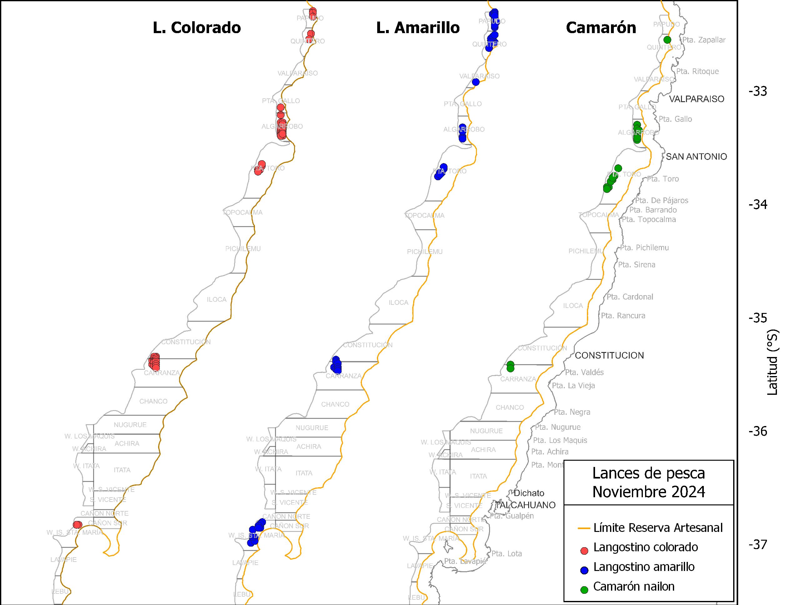 En noviembre se registraron capturas en caladeros localizados desde la región del Biobío hasta la región de Valparaíso, centrándose principalmente en el langostino colorado y secundariamente, en langostino amarillo. El langostino colorado presentó un total de 103 lances, que resultaron en una captura total de 334 toneladas. Por otro lado, el langostino amarillo fue capturado en 94 lances, totalizando una captura de 201 toneladas; sin embargo, solo el 36% de estas capturas correspondió exclusivamente a esta especie, la mayoría realizadas en los caladeros de la isla Santa María y Valparaíso.
