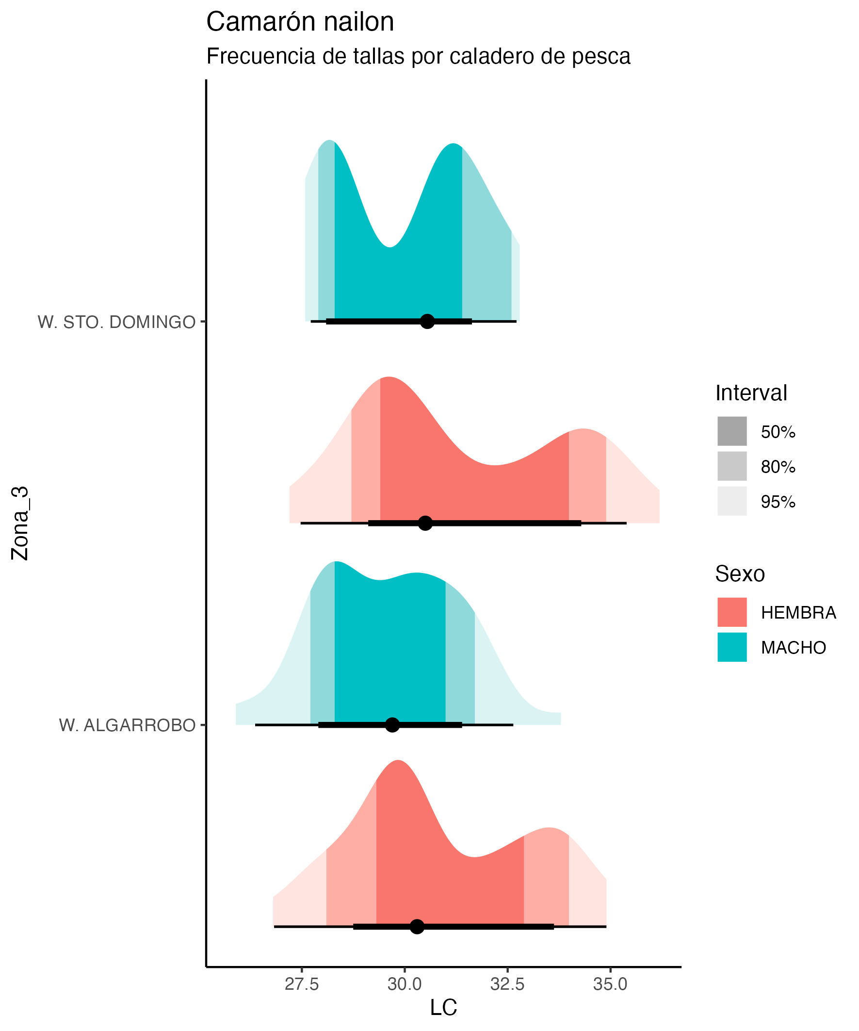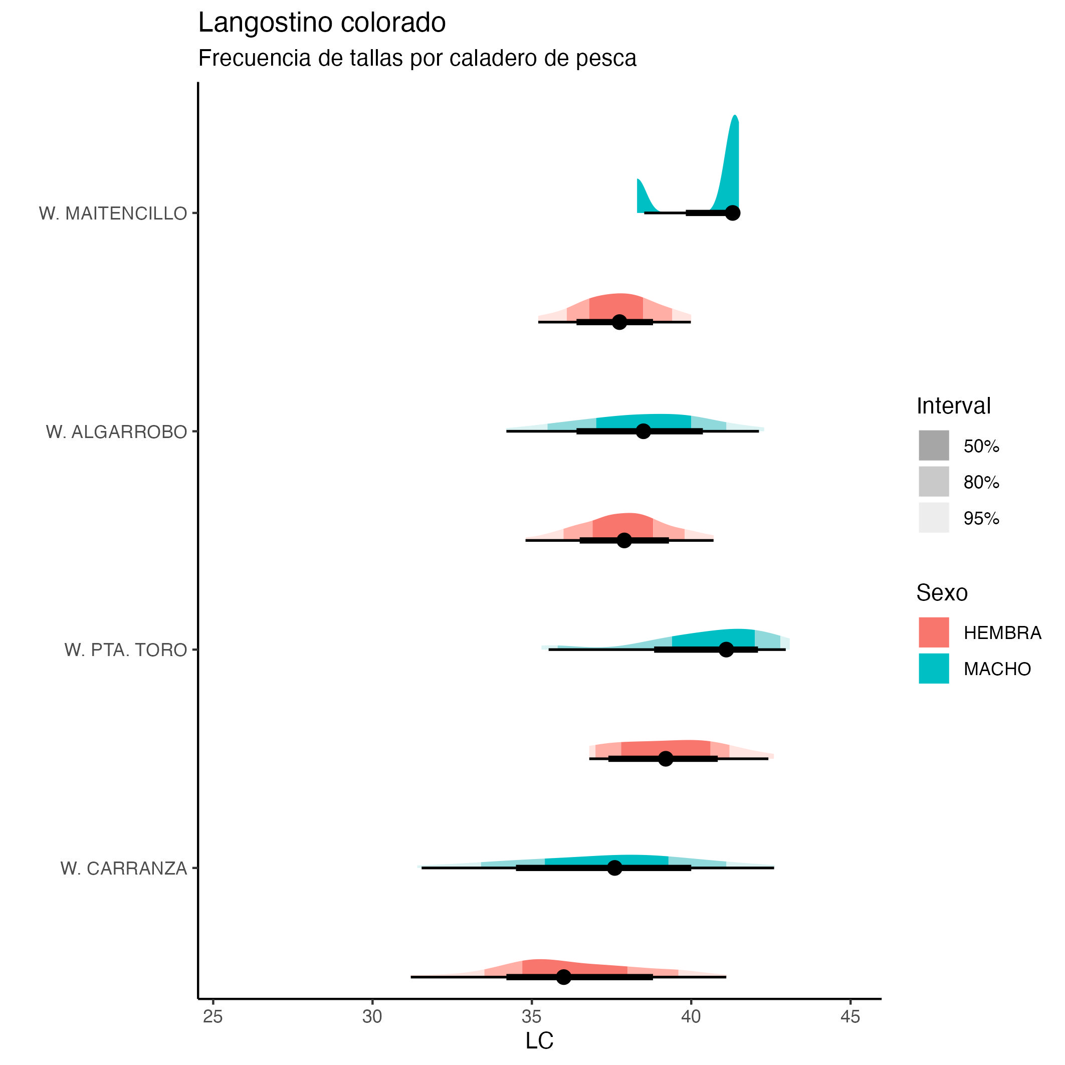 El análisis de la composición de tallas por zonas de pesca de langostino colorado mostró que las tallas modales más grandes se registraron en el caladero al oeste de Maitencillo, con tamaños superiores a los 40 mm (Fig. 12). En el caso del langostino amarillo y el camarón nilon, no se observaron diferencias significativas entre las zonas; sin embargo, en el langostino amarillo destacó el oeste de la isla Santa María, el cual presentó el rango más amplio de tallas (Figs. 13 y 14).