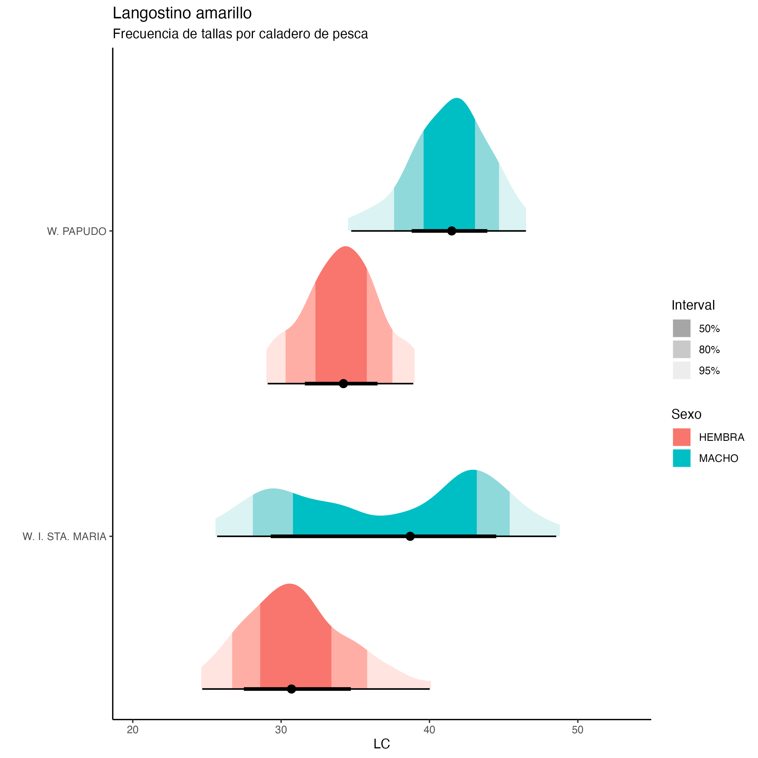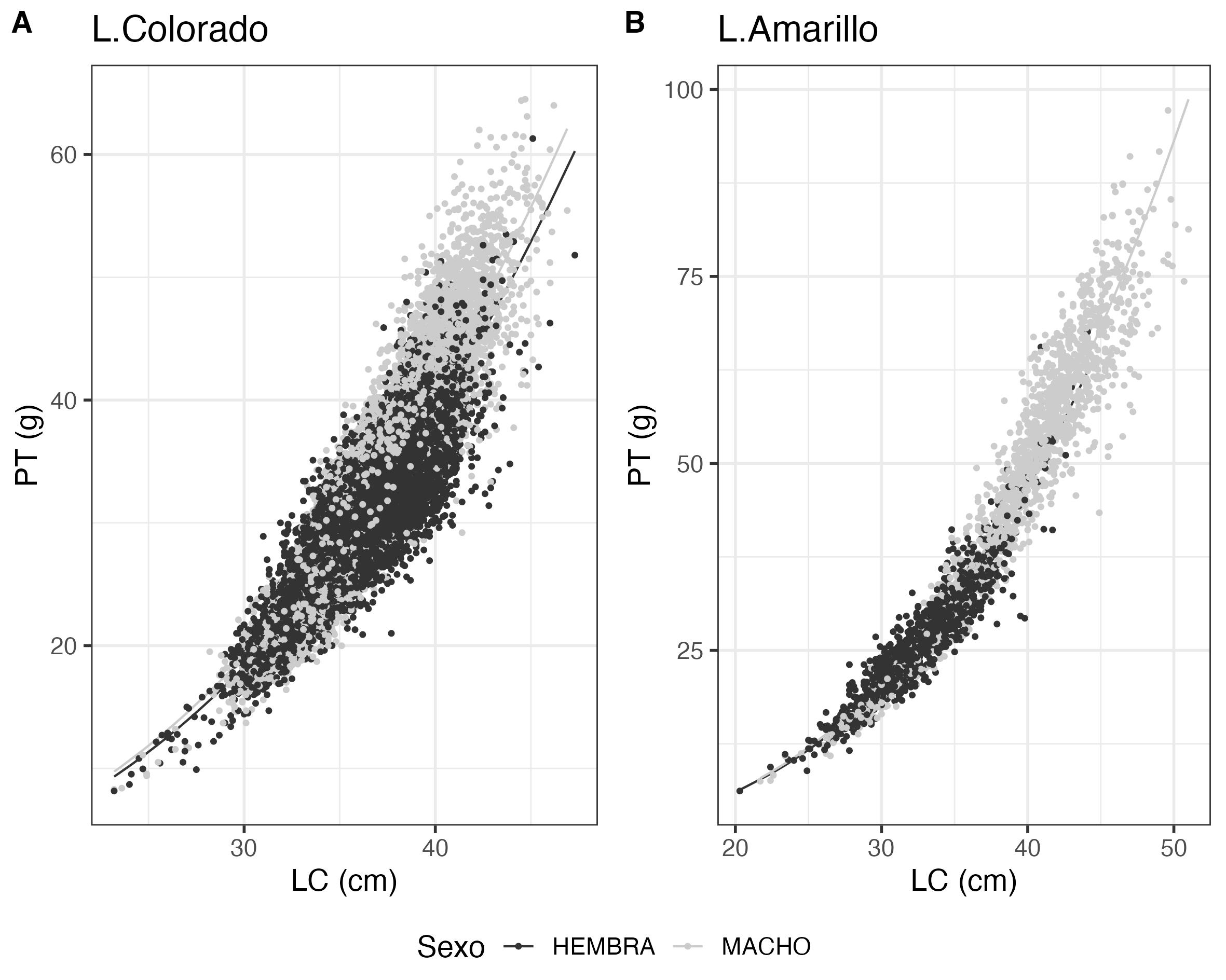 Con el objeto de comparar la relación longitud-peso entre machos y hembras de langostinos, se utilizó ejemplares que fueron pesados completos, es decir, con todas sus extremidades. El mejor modelo para la relación longitud-peso fue con una intersección fija y diferentes pendientes entre sexos, el peso esperado más alto a una talla determinada se presentó en machos de langostino colorado y amarillo (Fig. 15).
