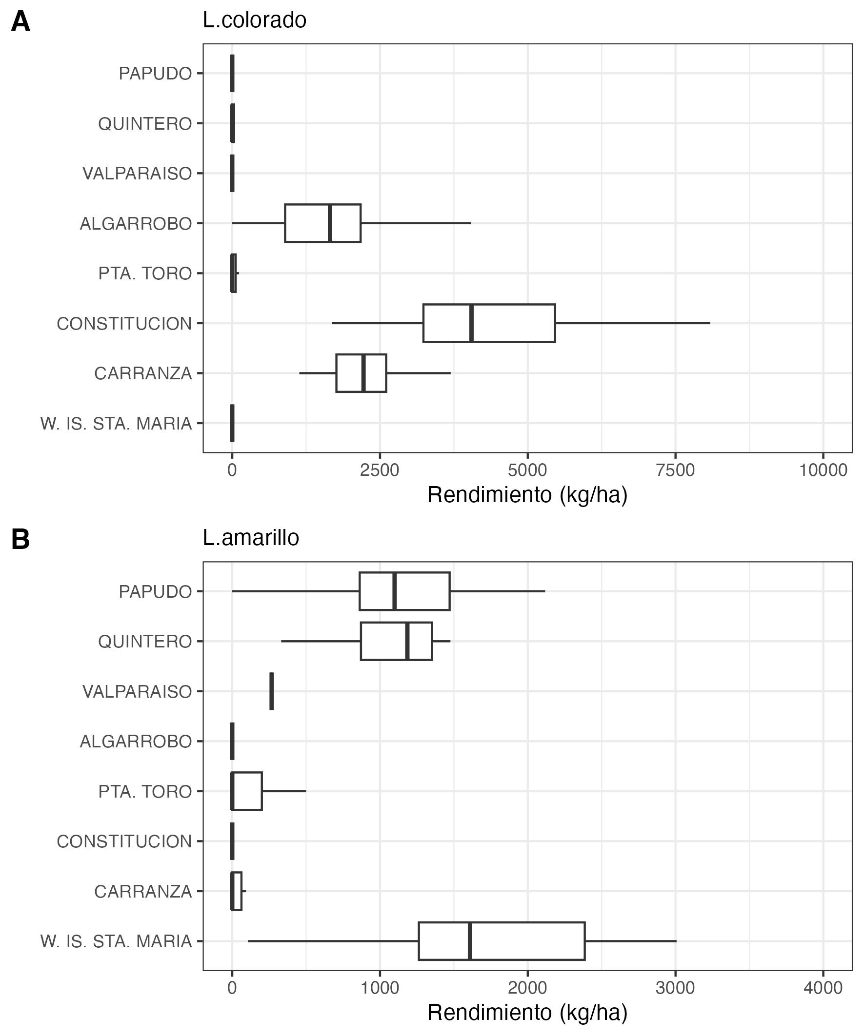 En cuanto a la distribución espacial del rendimiento pesquero durante noviembre, el langostino colorado destacó en el caladero de Algarrobo, donde las capturas fluctuaron entre 2500 y 7500 kg/ha (Figs. 5 y 6). En el caso del langostino amarillo, el mayor rendimiento se registró en la cuadra al weste de la isla Santa María, con capturas también entre 500 y 7.500 kg/ha (Figs. 5 y 6). En contraste, el camarón nailon presentó rendimientos bajos, inferiores a 2.500 kg/ha, siendo la cuadra de Punta Toro la que mostró los mejores resultados para esta especie (Fig. 5).