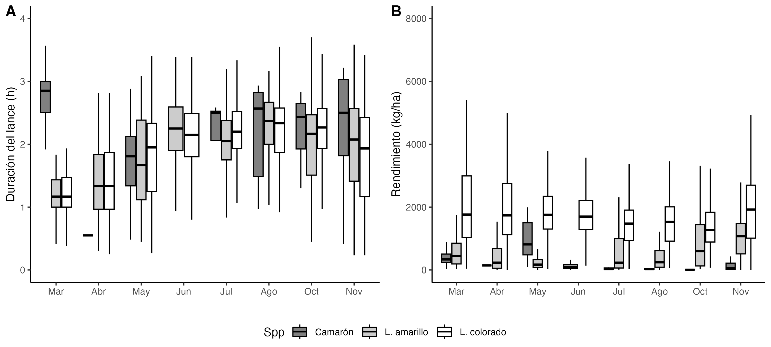 | Recurso | Mes | N° de lances(n) | Cap. (kg) | Cap.lances (kg/n) | h arrast.(ha) | Rend. (kg/ha) | Prof.de fondo(m) |