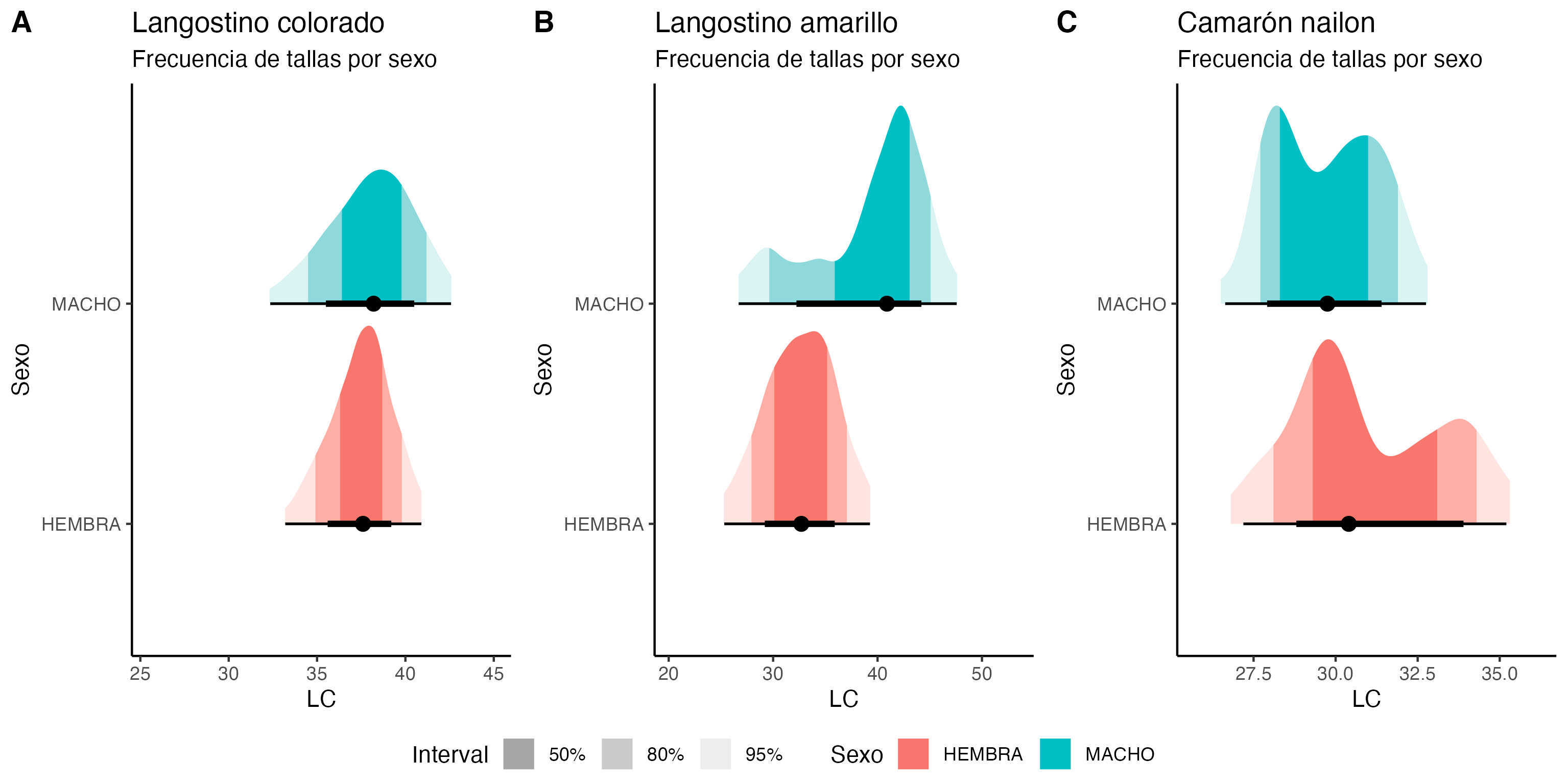 La comparación de las tallas del langostino colorado no revela diferencias significativas entre los sexos en ambas especies (t-Student, p > 0,05). La talla media es de 37,4 mm de longitud cefalotórax (LC) en hembras y de 38,1 mm LC en machos (Tabla 2, Fig. 10). En contraste, tanto el langostino amarillo como camarón nailon mostraron diferencias significativas entre sexos (Tabla 2, Fig. 11).