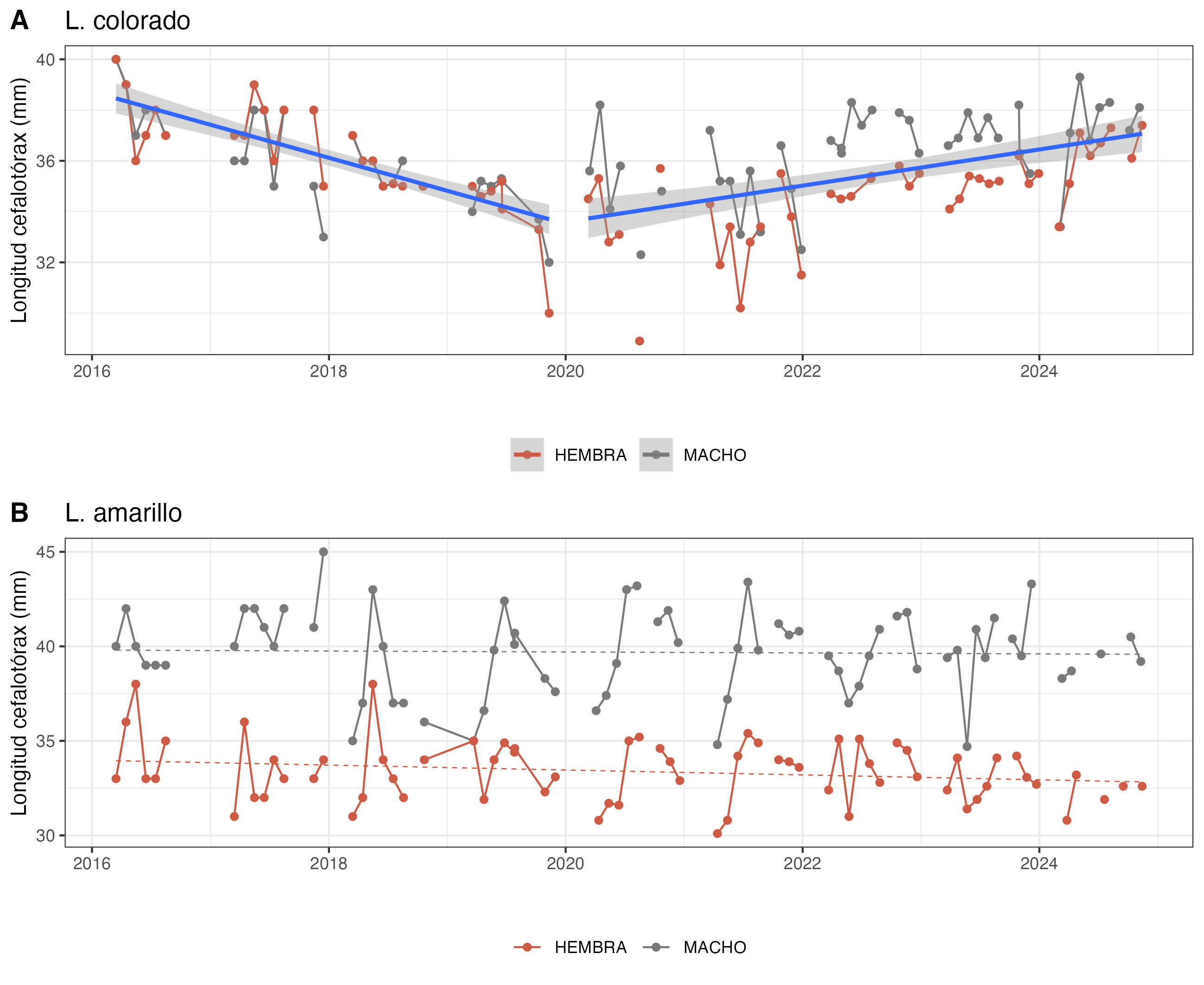 En cuanto a la talla media, se capturaron ejemplares de langostino colorado con una longitud cefalotórax (LC) promedio que oscila entre 25 y 45 mm, siendo los machos los que presentan las tallas más grandes. Al comparar las tallas medias a lo largo de los años, se observa que en marzo suelen comenzar con valores altos; sin embargo, este año se registraron tallas menores y sin diferenciación sexual. Pero a medida que ha avanzado la temporada de pesca, esta situación ha ido cambiando, a salvo en el mes de junio, las tallas han tendido a aumentar, manteniéndose por encima de los 36 mm LC desde mayo. En cuanto a langostino amarillo, si bien este año no se han realizado muestreos biológicos de forma periódica, este mes se registró un descenso en la talla media pero aun continúan en torno a las tallas medias históricas (Fig. 9, Tabla 2).