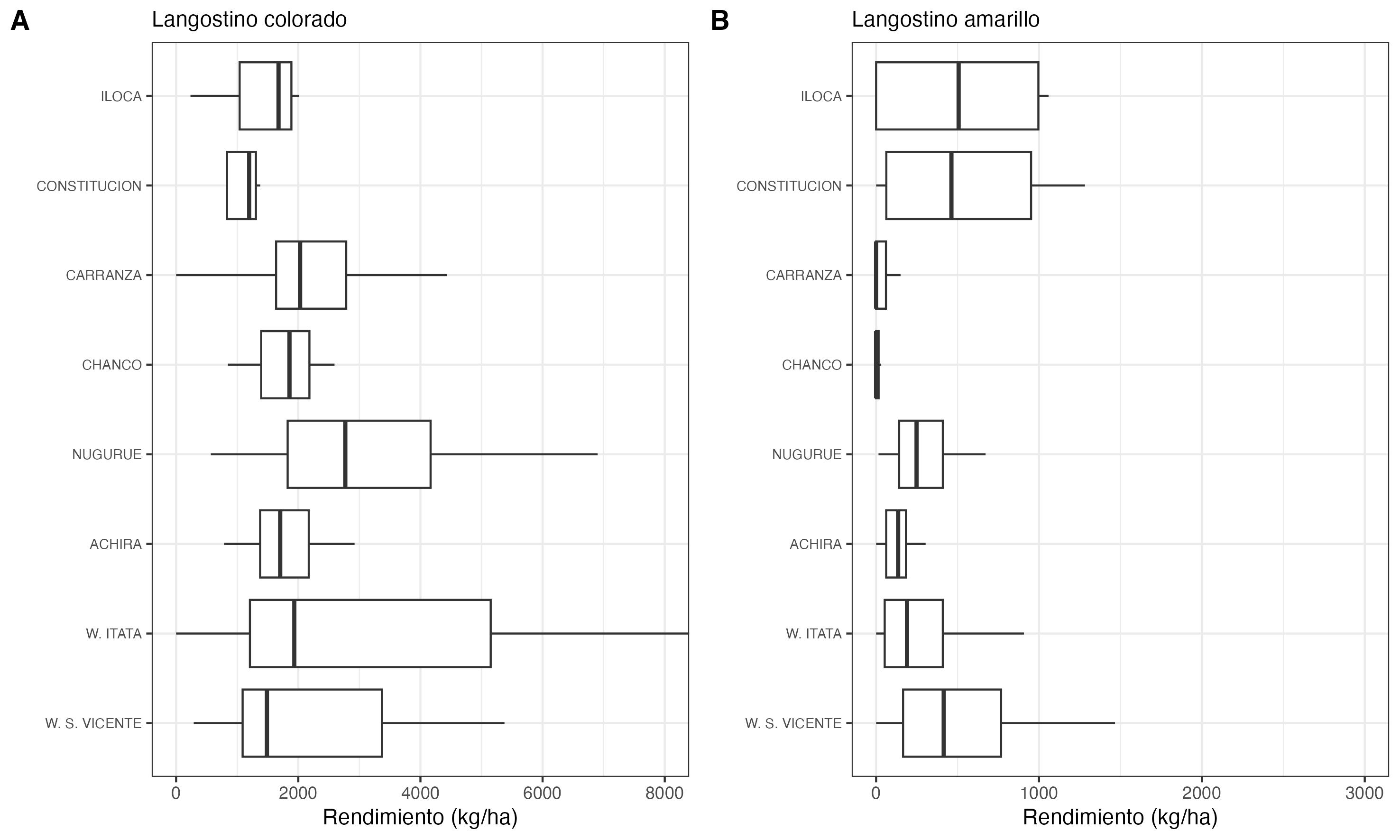 En cuanto a la distribución espacial del rendimiento durante abril, se destacaron los caladeros de oeste de Itata, Nugurue, Carranza y Chanco, con valores promedio entre 2000 y 2500 kg/ha para langostino colorado (Fig. 4 y 5). Para langostino amarillo, los mayores rendimientos se registraron en Iloca, Constitución y San Vicente, con medias cercanas a 500 kg/ha.