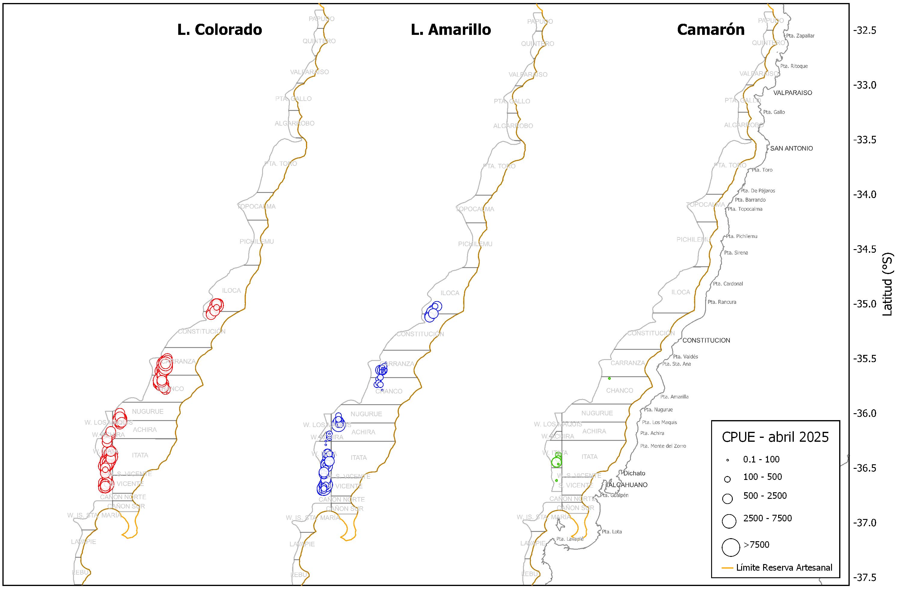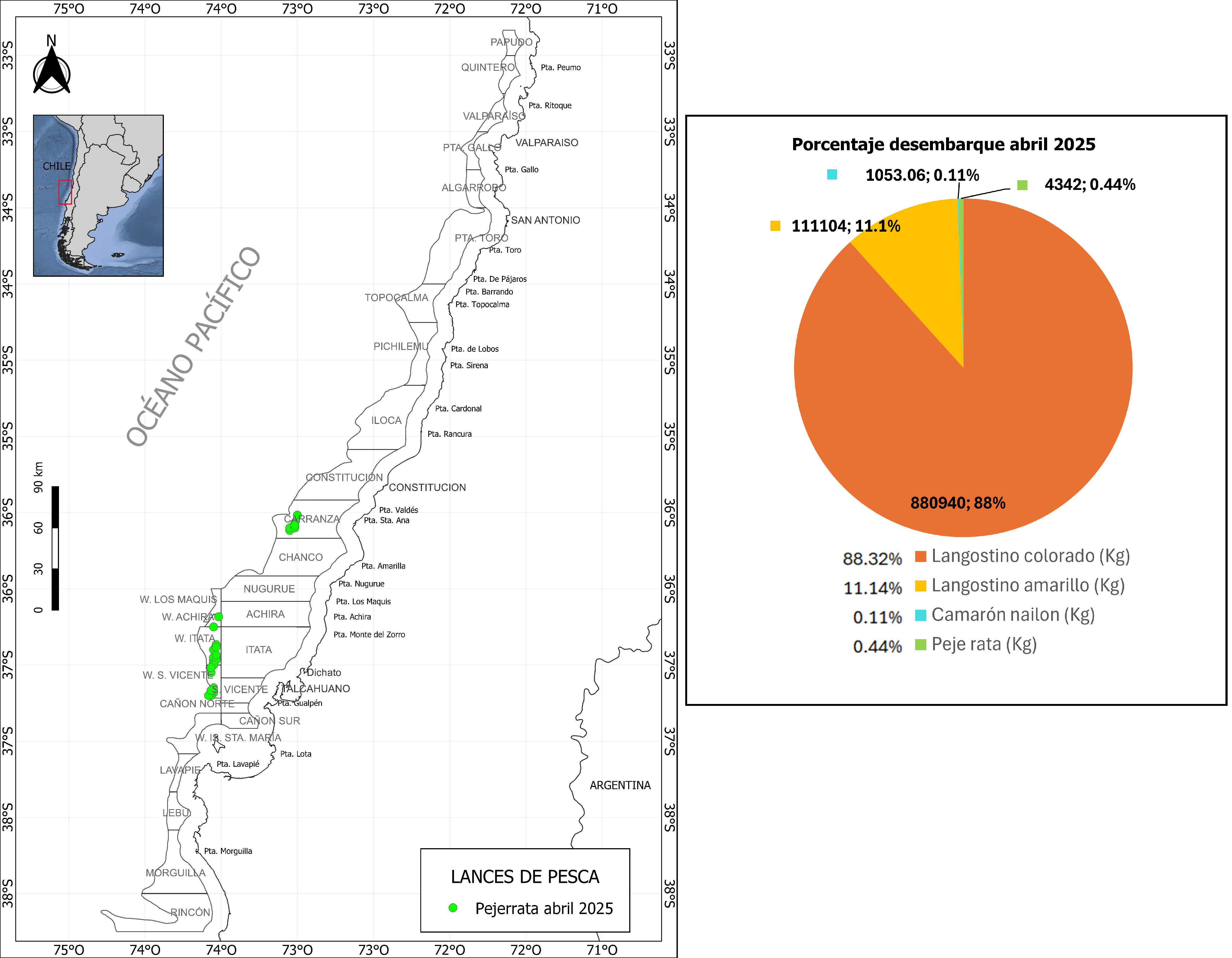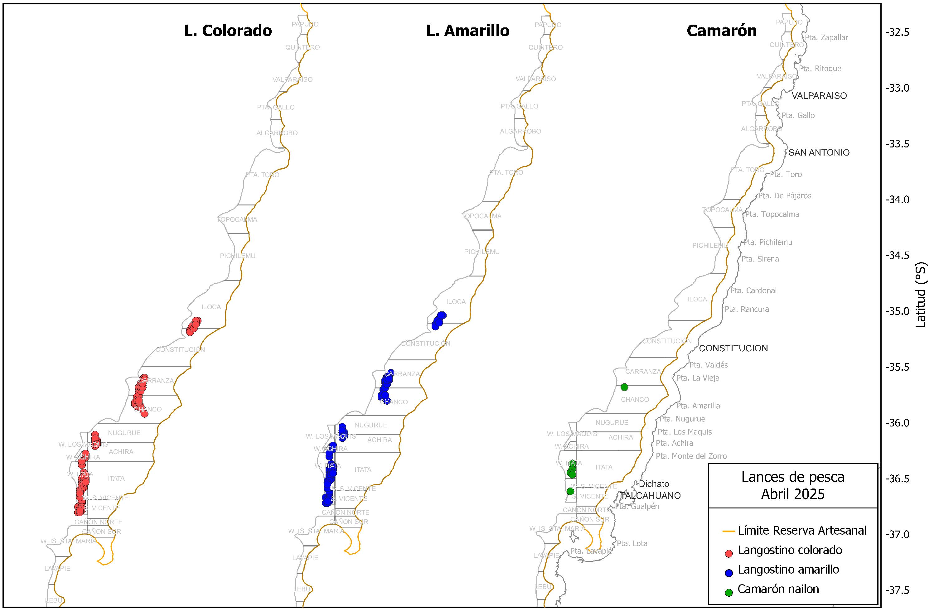 Durante abril de 2025, las operaciones de pesca se realizaron entre las regiones del Biobío y el Maule, destacando los caladeros de Nugurue, Itata, San Vicente, Iloca y Constitución. El esfuerzo pesquero se orientó principalmente al langostino colorado, con un 98 % de los lances. De estos, el 72 % correspondió a capturas mixtas con langostino amarillo, el 26 % fueron lances exclusivos de langostino colorado, y el 2 % restante incluyó mezclas con camarón nailon.