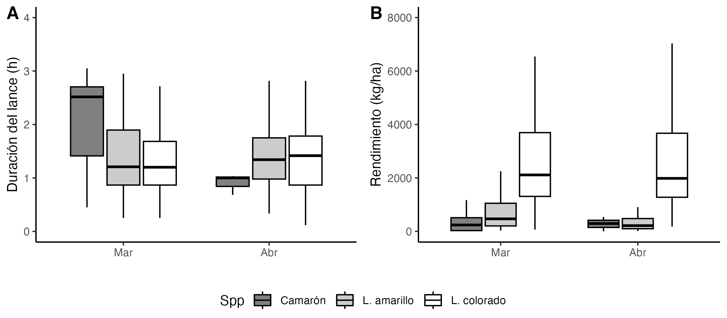 Las capturas totales fueron lideradas por el langostino colorado con 805 toneladas y un rendimiento promedio de 2202 kg/ha. El langostino amarillo sumó 89 toneladas con un rendimiento de 328 kg/ha, y el camarón nailon alcanzó 1 tonelada siendo capturado solo como fauna acompañante.