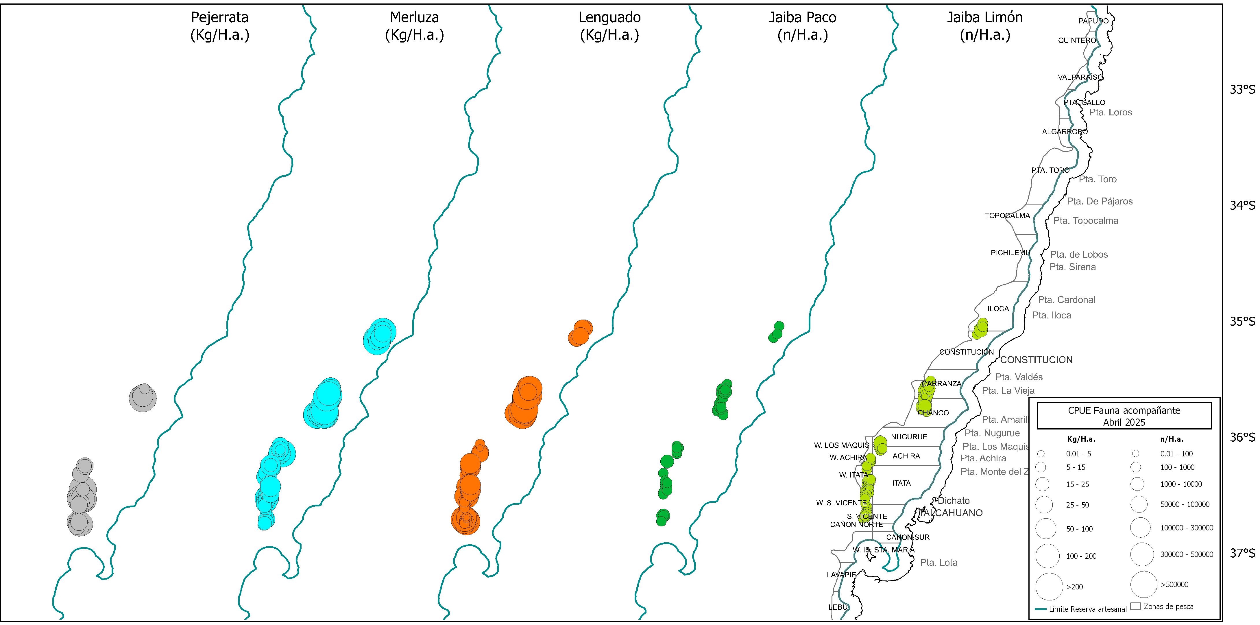 Las operaciones de pesca realizadas durante abril de 2025 por la flota de Crustaceos Pesca Sur evidenciaron la presencia de pejerrata, como fauna acompañante, en las zonas de Carranza, Achira, Itata, oeste de San Vicente y el Cañon norte (Fig. 13). Esta especie representó solo el 0.44 % del total de las capturas alcanzando un volumen de 4 toneladas.