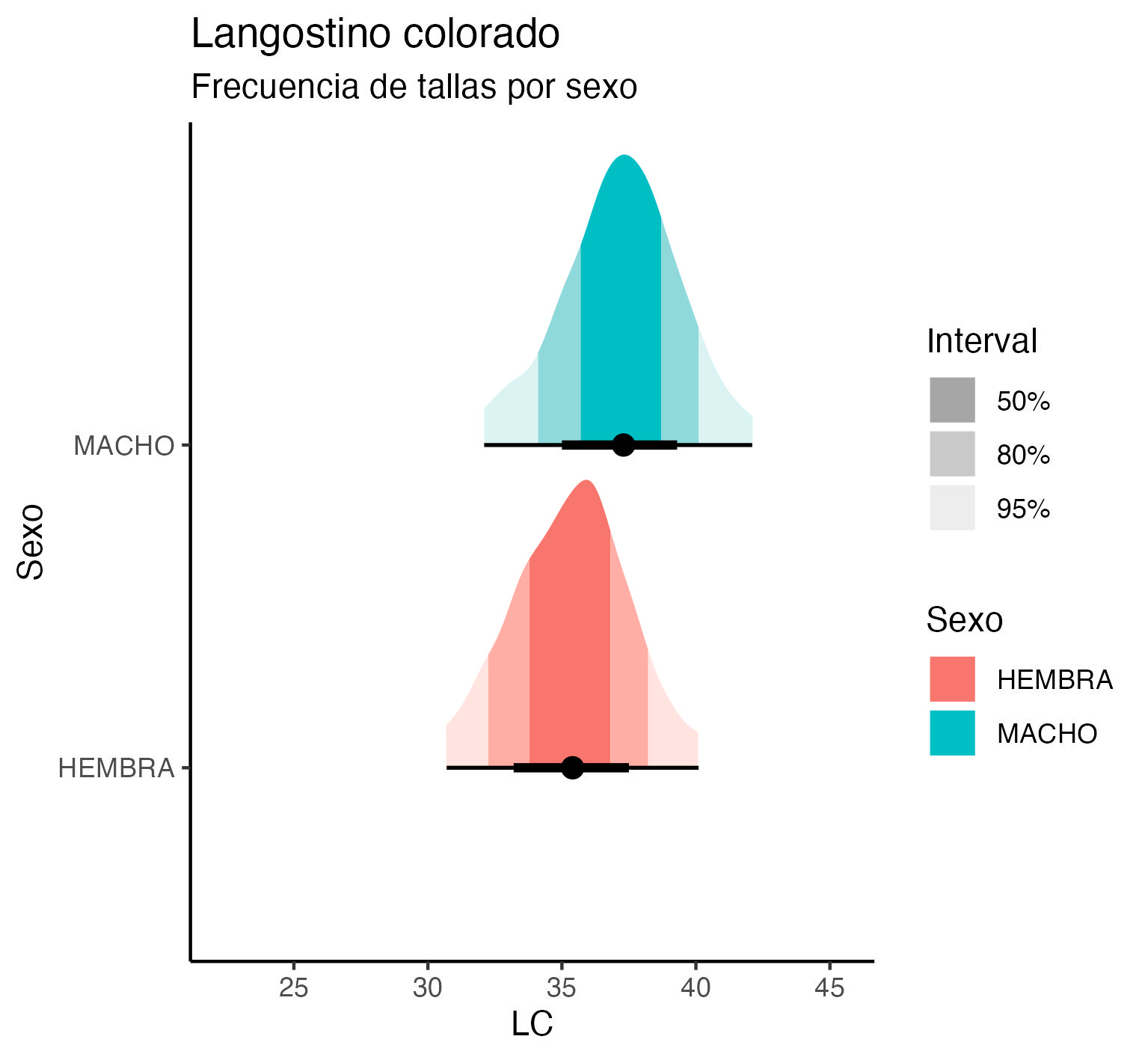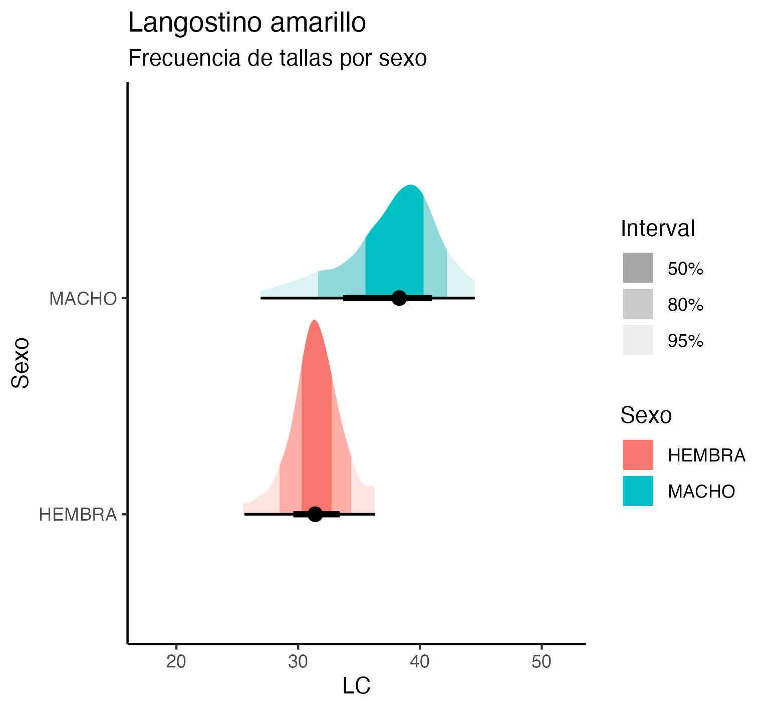 El análisis de tallas del langostino colorado y del langostino amarillo evidenció diferencias significativas entre sexos (prueba t de Student, p < 0.05). En el caso del langostino colorado, los machos alcanzaron una talla media de 37 mm LC, superior a la de las hembras, que fue de 35 mm LC (Fig. 9). Por su parte, en el langostino amarillo, las hembras registraron una talla media de 31 mm LC, mientras que los machos alcanzaron los 37 mm LC (Tabla 2, Fig. 10).