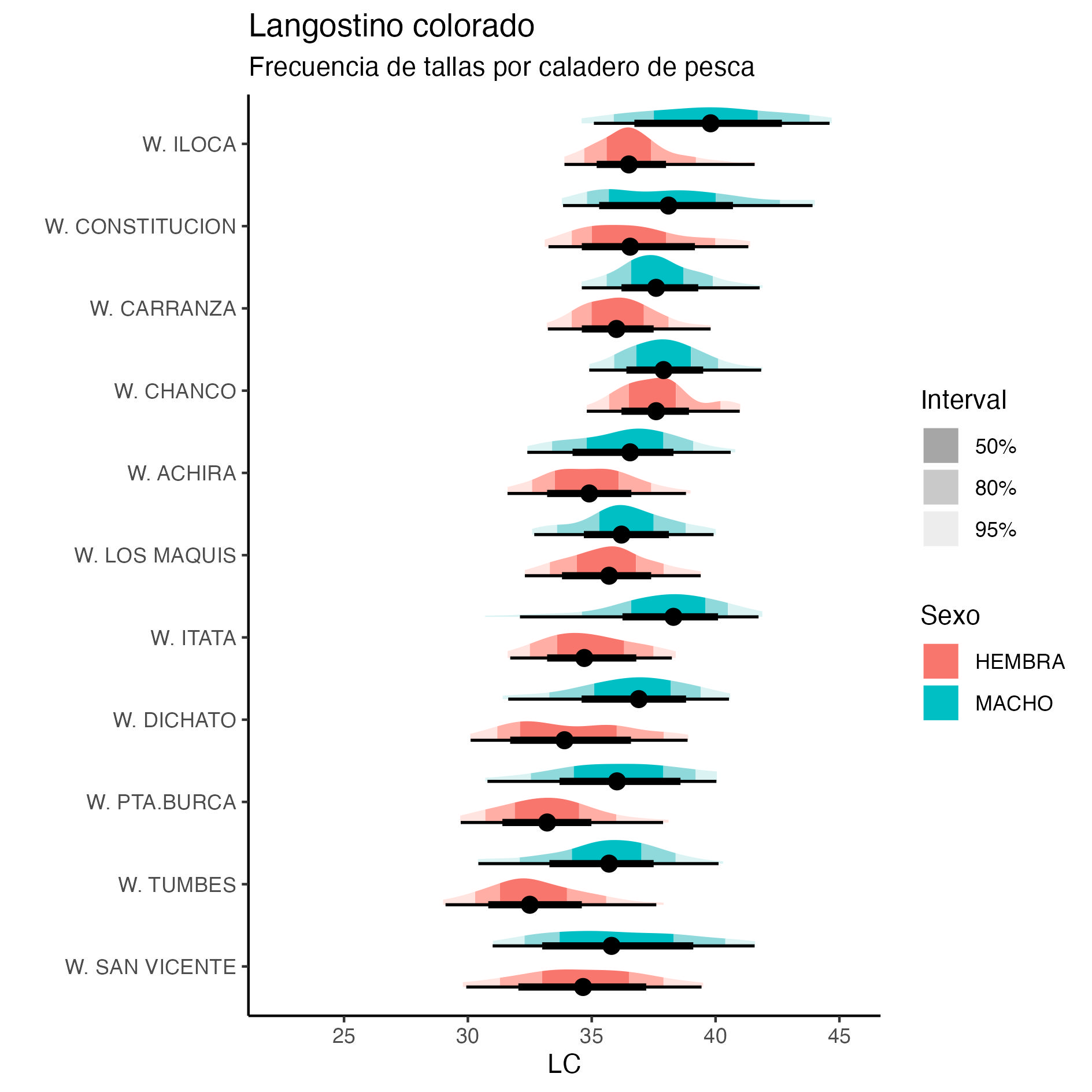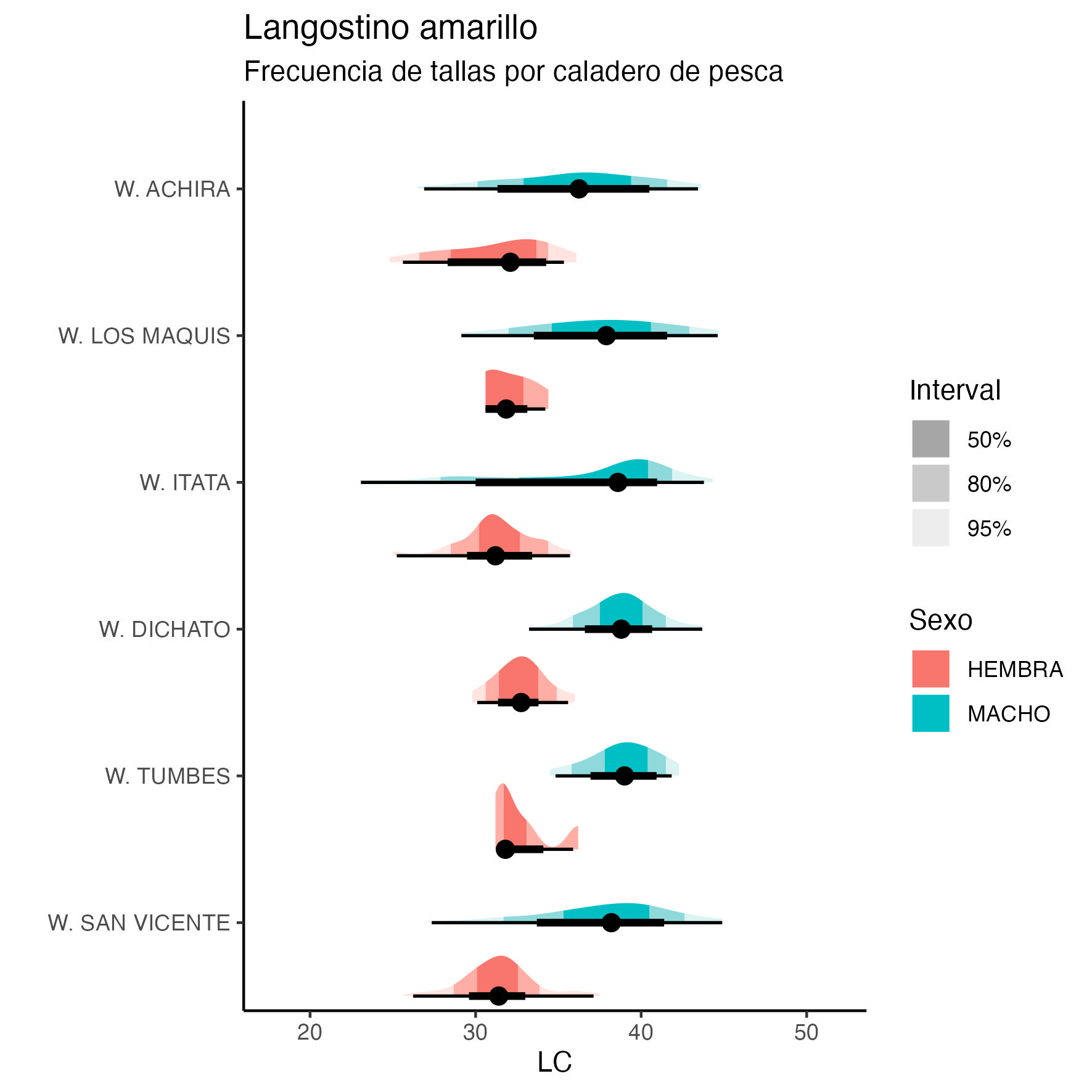 En cuanto a la composición de tallas por zona de pesca, el langostino colorado presentó las tallas modales más pequeñas en el caladero de Tumbes, mientras que las más grandes se registraron en los sectores ubicados al oeste de Iloca y Constitución (Fig. 11). En el caso del langostino amarillo, las tallas mostraron una distribución similar entre las distintas zonas, destacando el oeste de Itata en los machos por presentar un mayor rango de tallas (Fig. 12).
