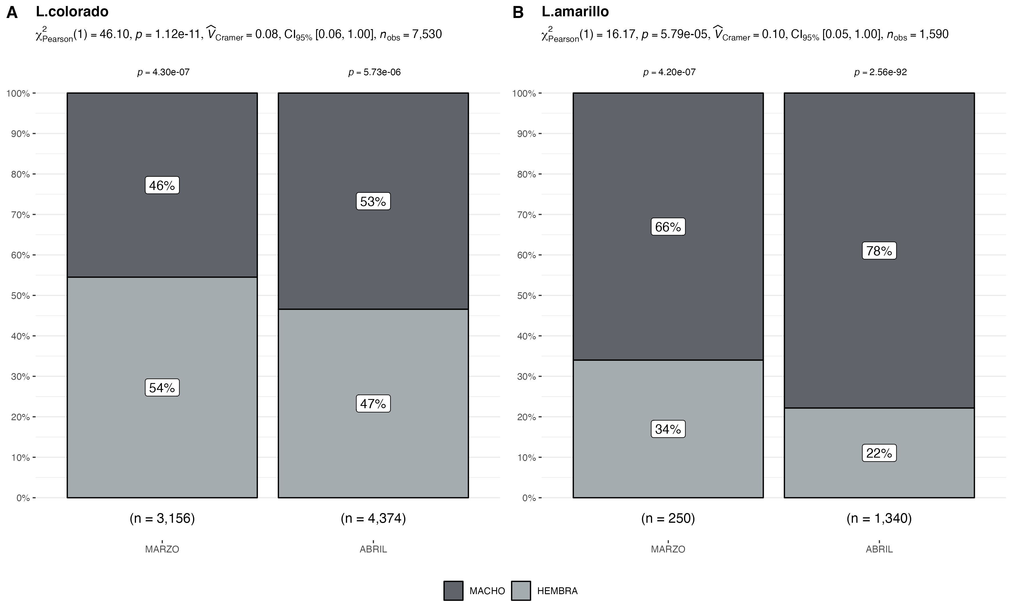 En términos biológicos, el langostino colorado mostró una proporción sexual levemente inclinada hacia los machos (53 %). De manera similar, en el langostino amarillo predominaron los machos, que representaron el 78 % del total.