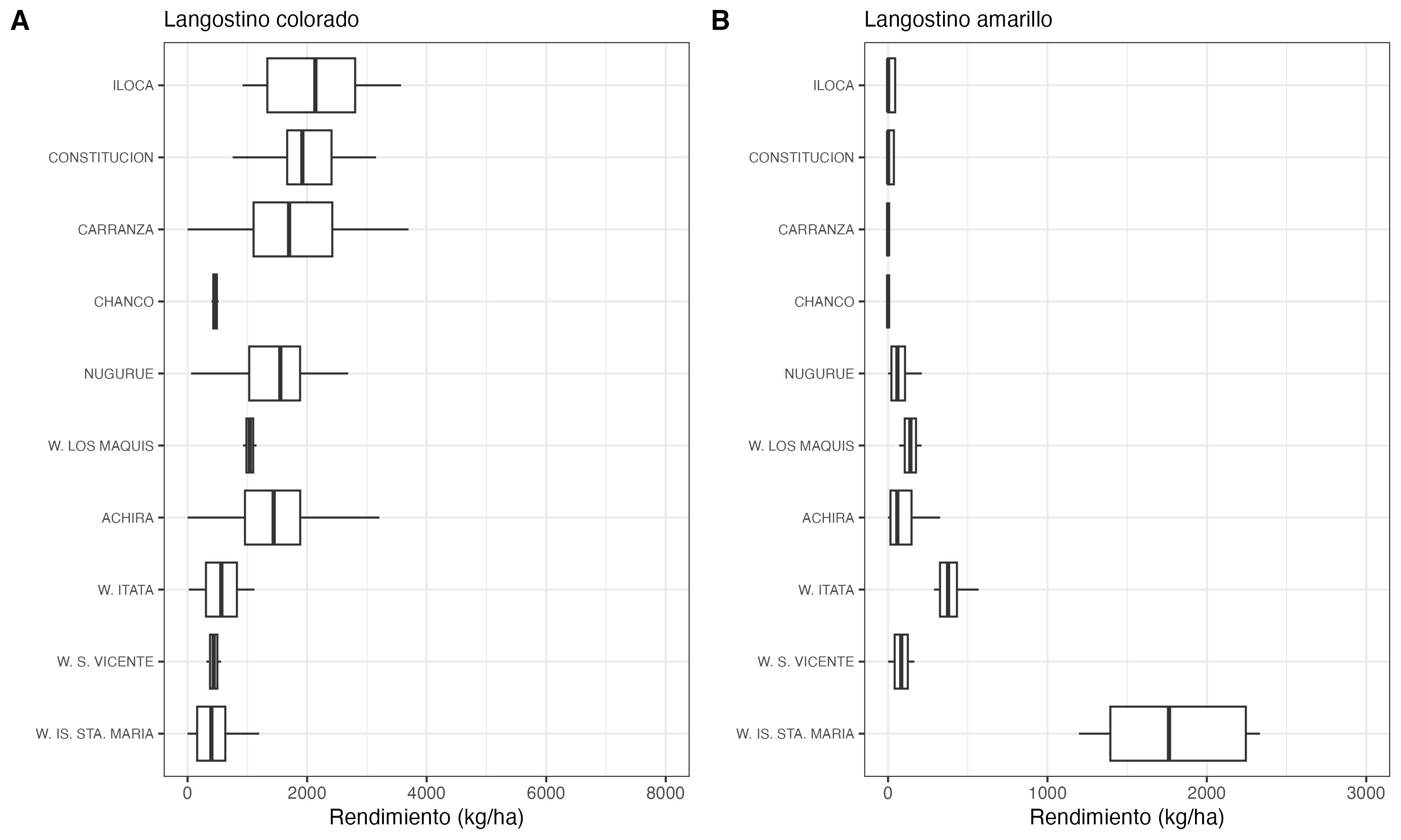 En cuanto a la distribución espacial del rendimiento de pesca durante el mes de mayo se destacaron los caladeros de Iloca, Constitución, Carranza con de alto rendimiento de langostino colorado con medias de 2000 kg/ha (Fig. 4, 5). En el caso del langostino amarillo, cuya captura se produjo en conjunto con langostino colorado, los mayores rendimientos se registraron en las cuadra del oeste de la isla Stanta María, con valores sobre entre 1300-2500 kg/ha (Fig. 4, 5).