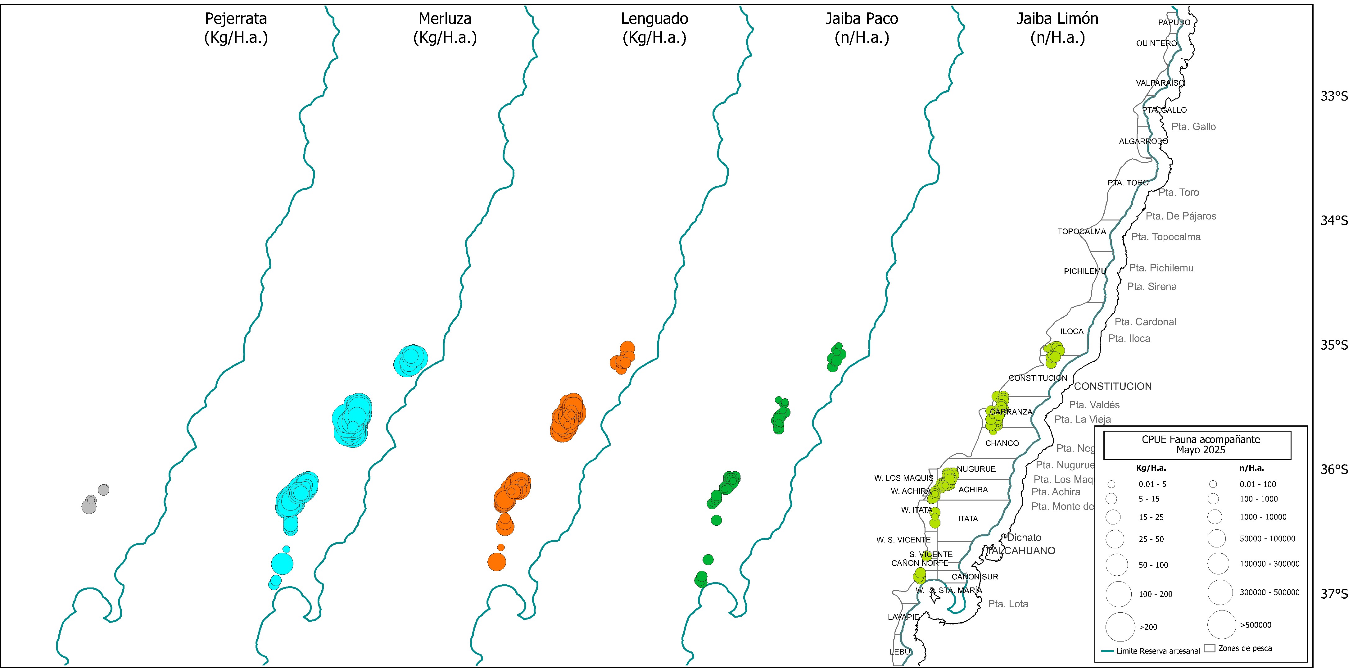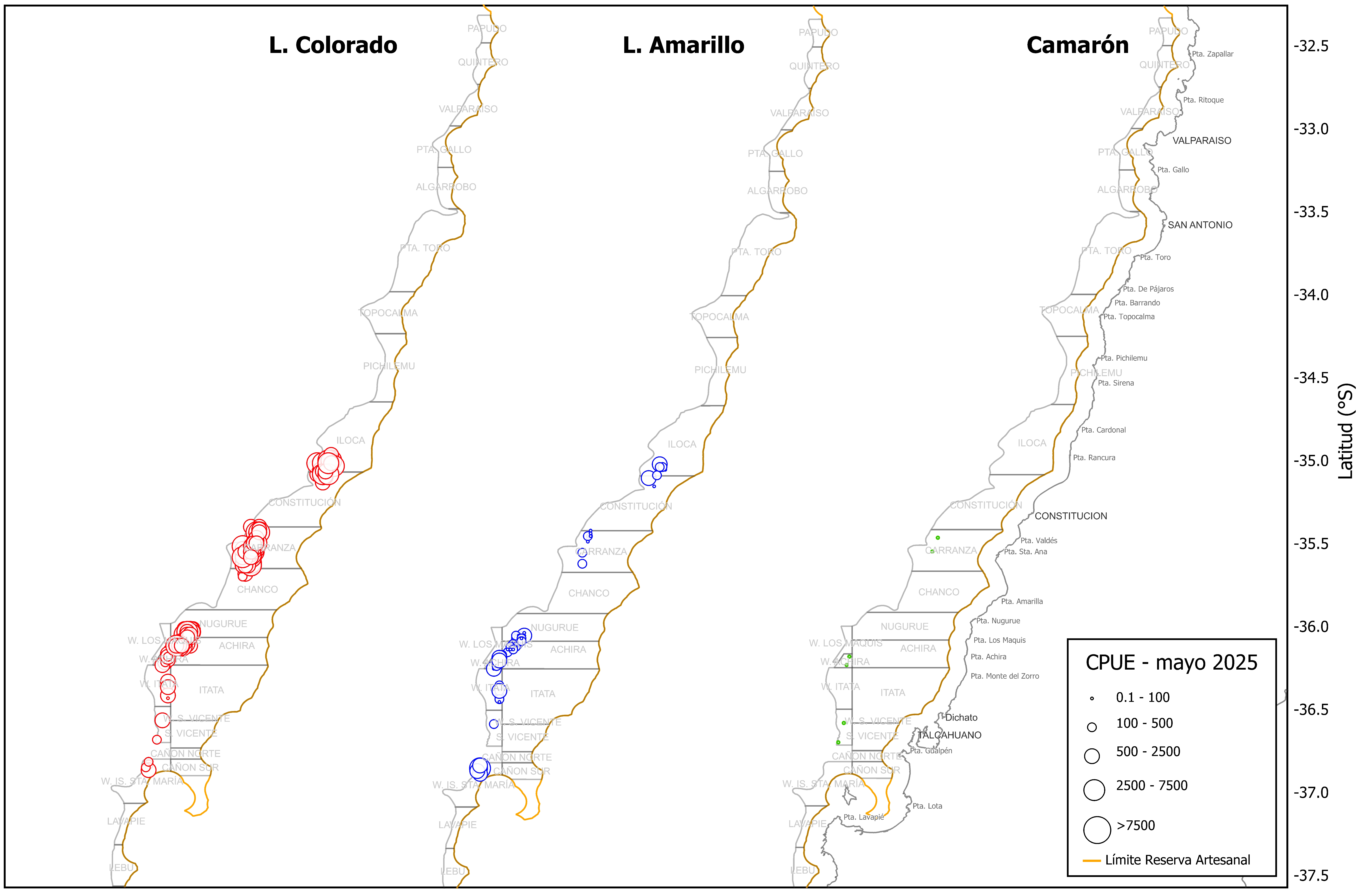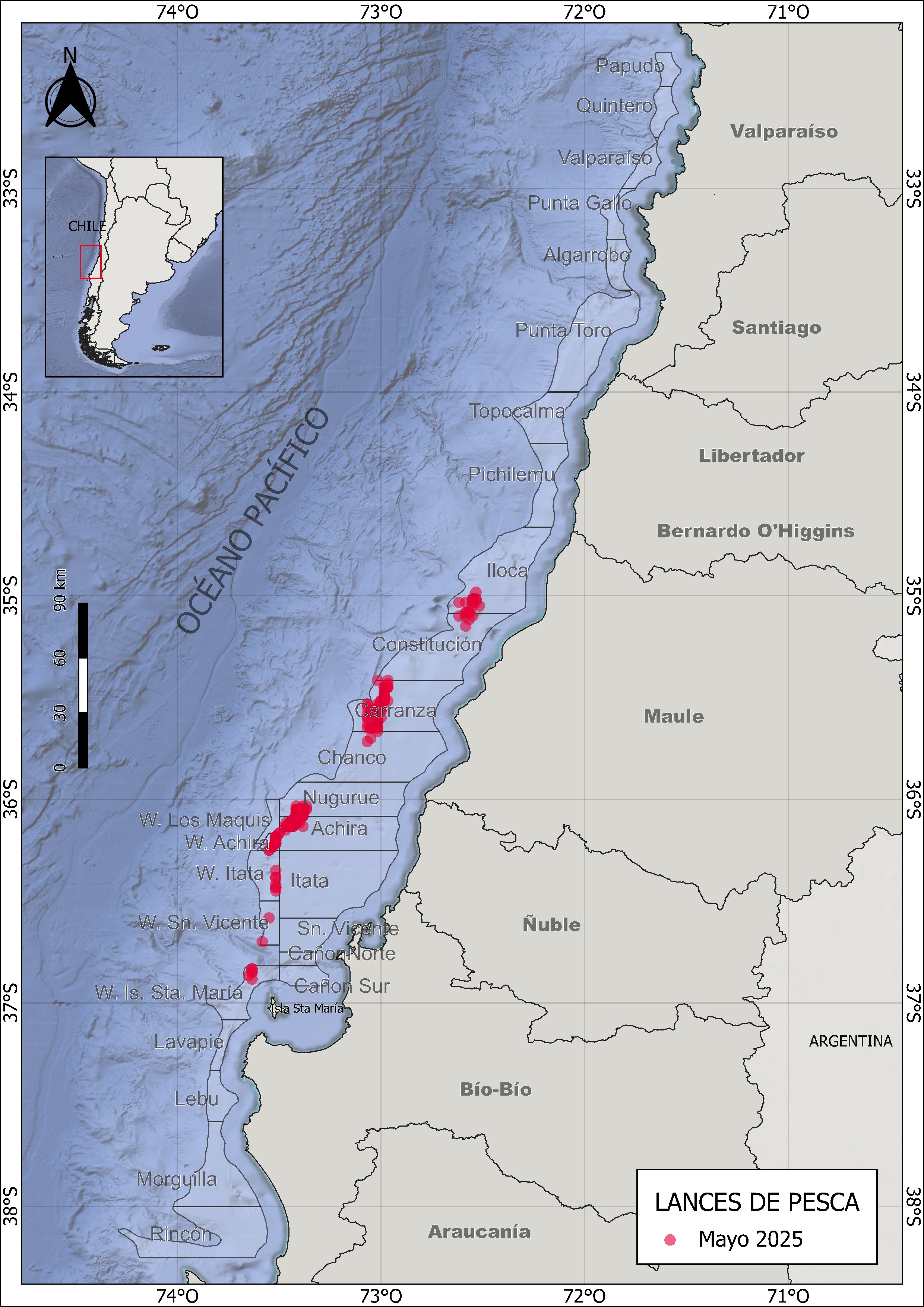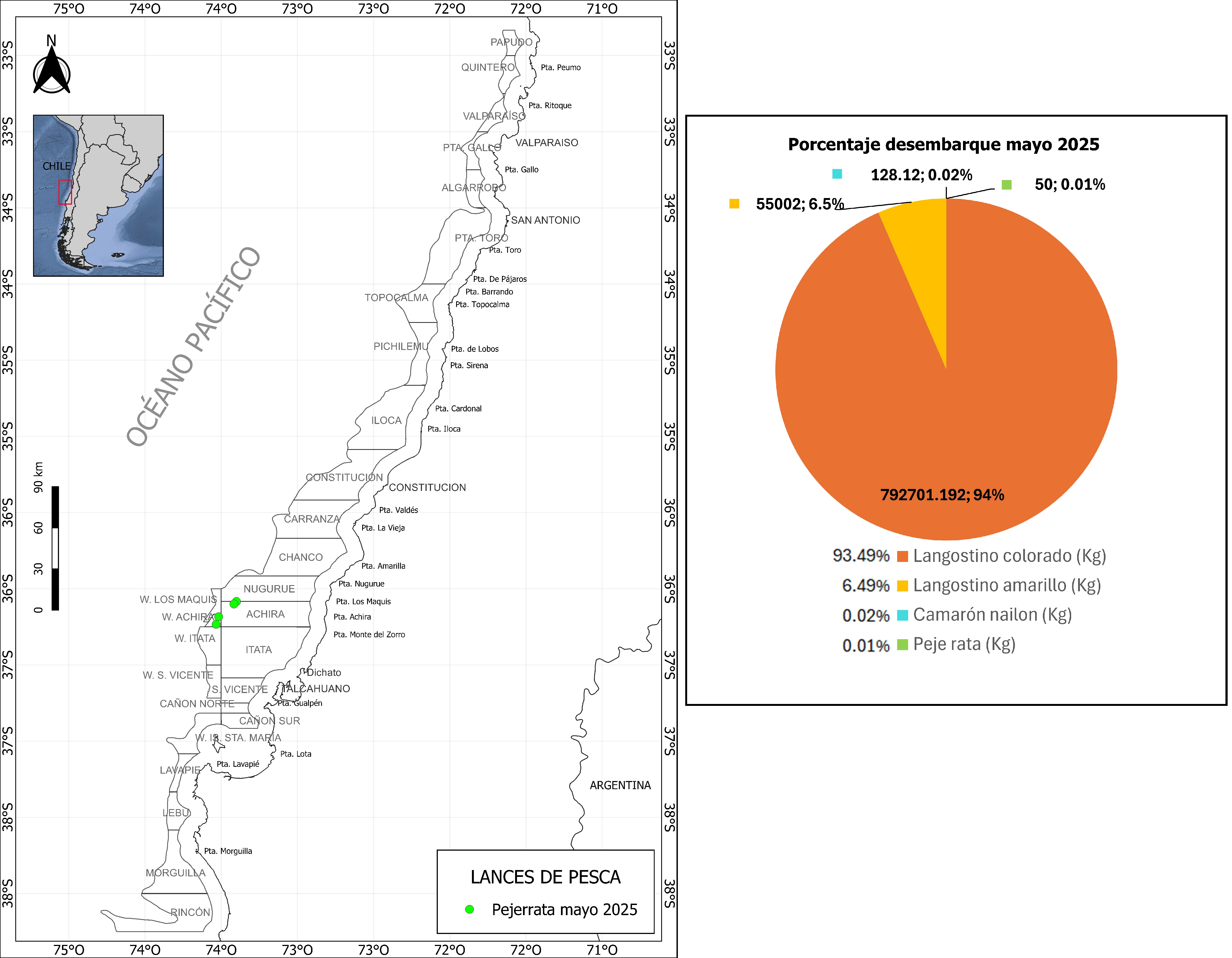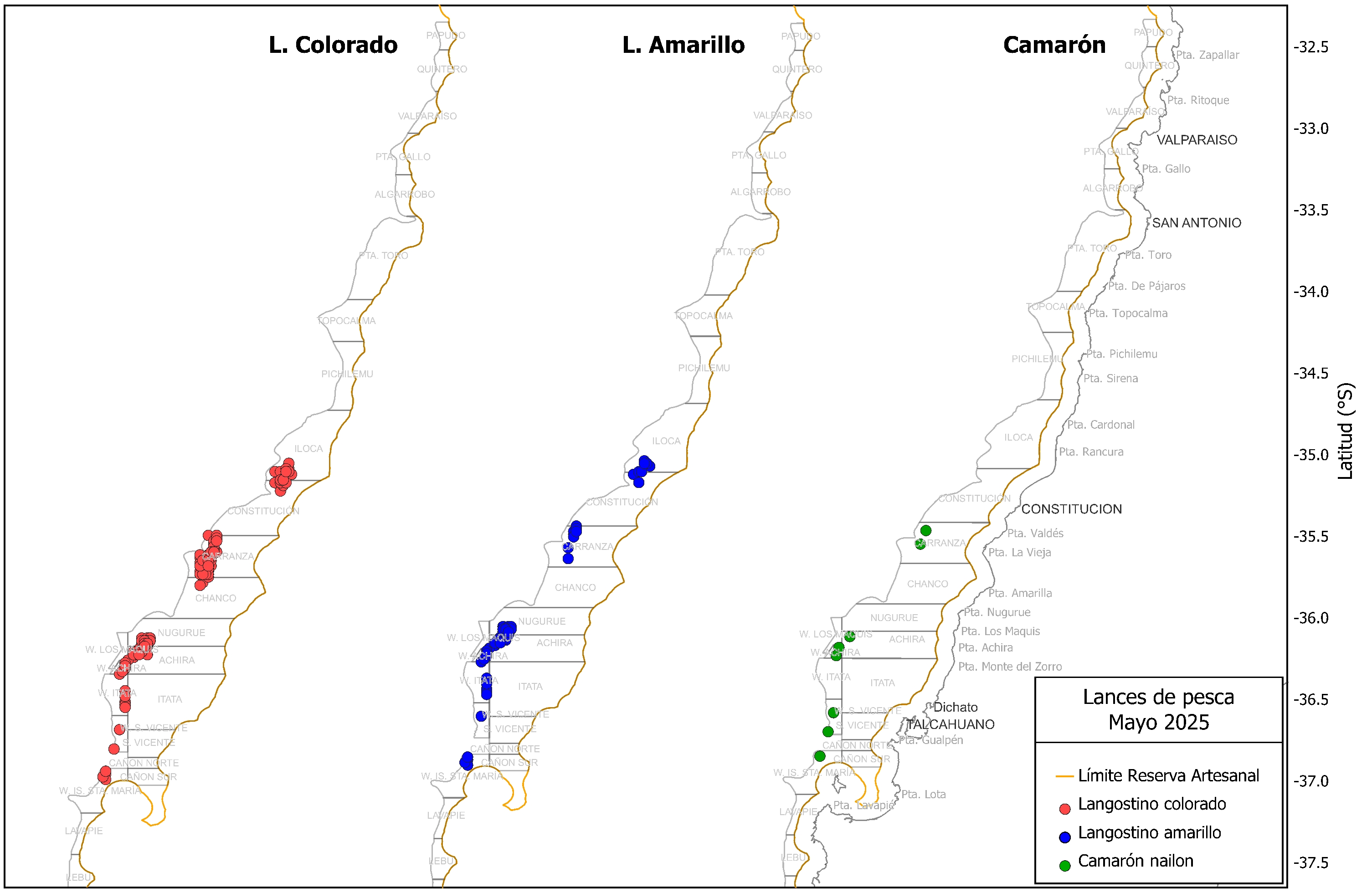 Durante mayo de 2025, las operaciones de pesca se realizaron entre las regiones del Biobío y el Maule, destacándose los caladeros de Iloca, Constitución, Carranza, Achira y el oeste de la isla Sta. María. El esfuerzo pesquero estuvo principalmente dirigido al langostino colorado (98 % de los lances) de los cuales el 53 % correspondio a capturas mixtas junto a langostino amarillo y el 45% fue exclusivo de langostino colorado, y el otro 2% a mezcla con camaron nailon.