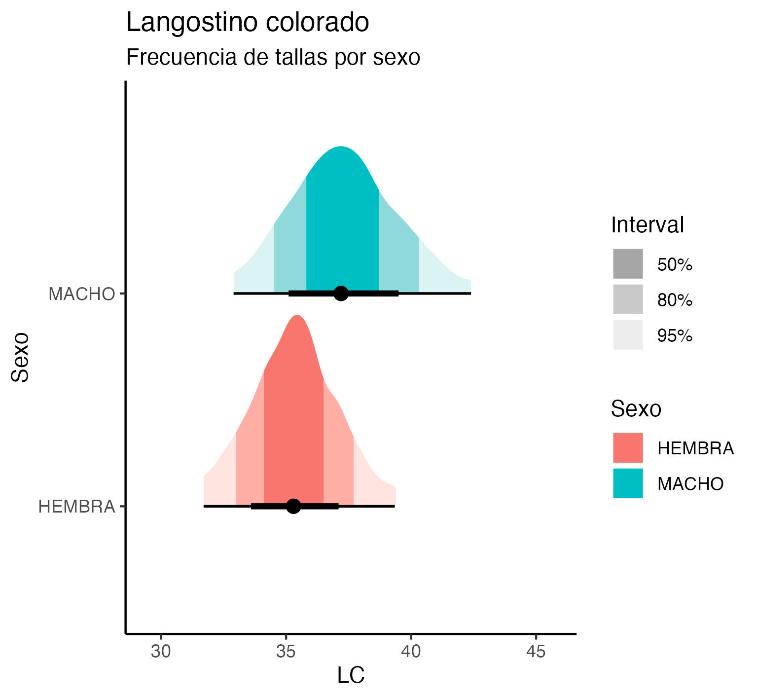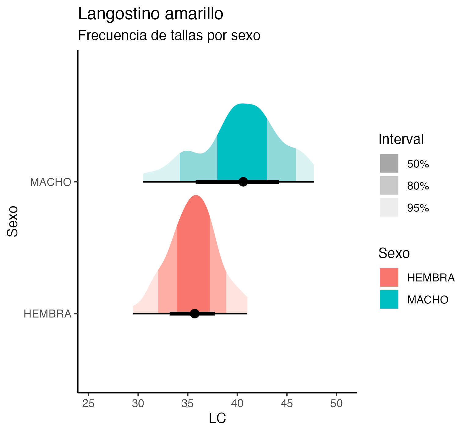El análisis de tallas del langostino colorado y del langostino amarillo evidenció diferencias significativas entre sexos (prueba t de Student, p < 0.05). En el caso del langostino colorado, los machos alcanzaron una talla media de 37 mm LC, superior a la de las hembras, que fue de 35 mm LC (Fig. 9). Por su parte, en el langostino amarillo, las hembras registraron una talla media de 35 mm LC, mientras que los machos alcanzaron los 40 mm LC (Tabla 2, Fig. 10).
