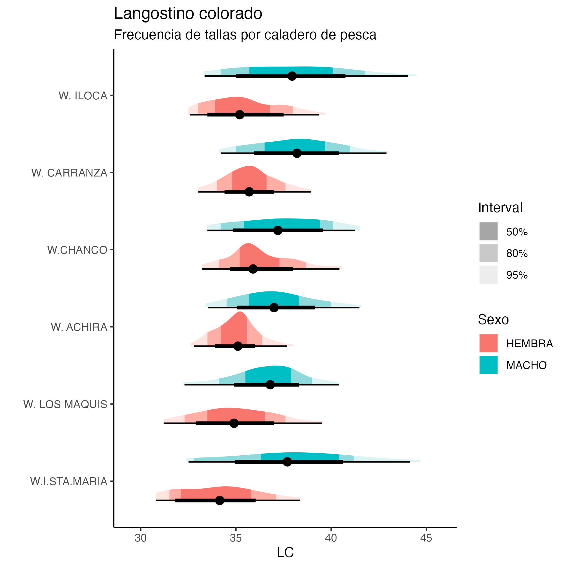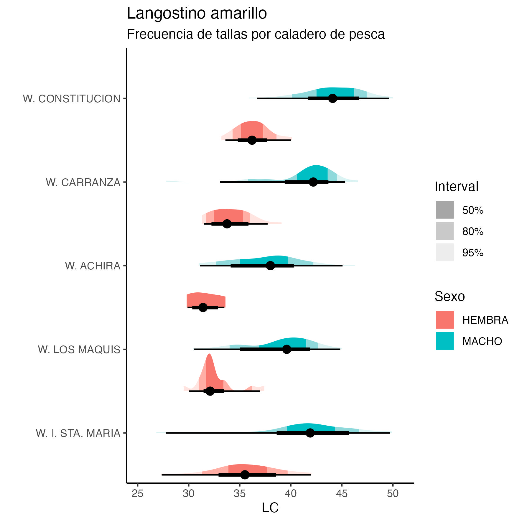 En cuanto a la composición de tallas por zona de pesca, langostino colorado mostró las tallas modales más pequeñas en el caladero de la isla Santa María, mientras que las tallas más grandes se registraron al oeste de Iloca y Carranza (Fig. 11). Para langostino amarillo en cambio las mayores tallas se presentaron en Constitución y el oeste de la isla Santa María (Fig. 12).
