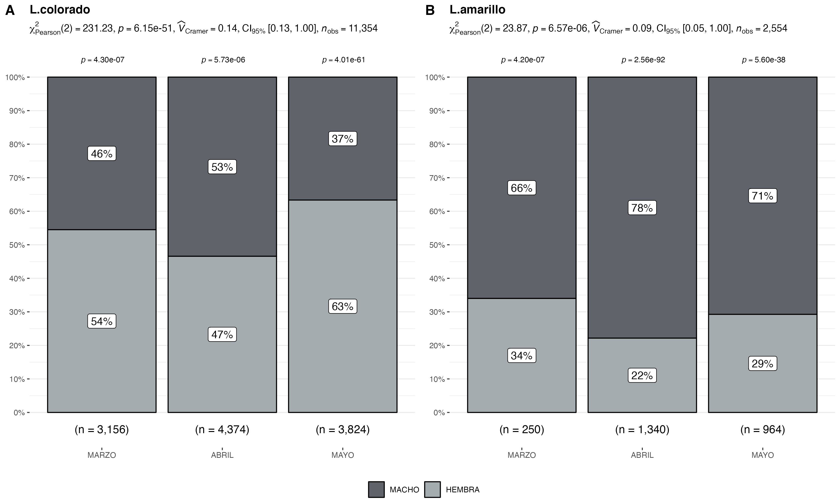 Durante las capturas de mayo de 2025, el langostino colorado presentó una proporción sexual favorable a las hembras, con un 63 % del total. En contraste, en el langostino amarillo predominó la presencia de machos, alcanzando un 71 % (Fig. 6).