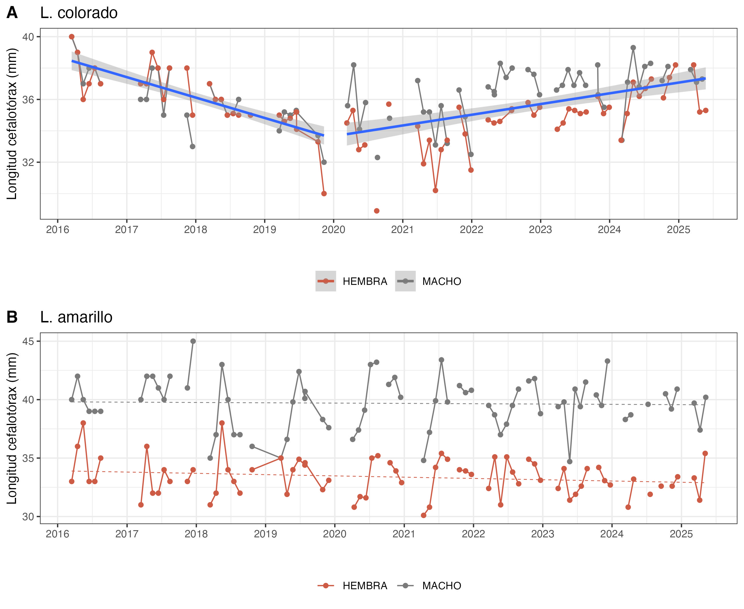 En cuanto a las tallas promedio, el langostino colorado presentó longitudes cefalotorácicas entre 29 y 46 mm, con medias de 37,3 mm en machos y 35,3 mm en hembras. En comparación con temporadas anteriores, las tallas medias al inicio de este año fueron particularmente altas, superando los 37 mm LC. Sin embargo, durante este mes se observó un descenso marcado en las hembras (Fig. 7). En langostino amarillo, los machos alcanzaron tallas promedio de 40,2 mm LC, superiores a las de las hembras (35,4 mm LC) (Tabla 2, Fig. 7).