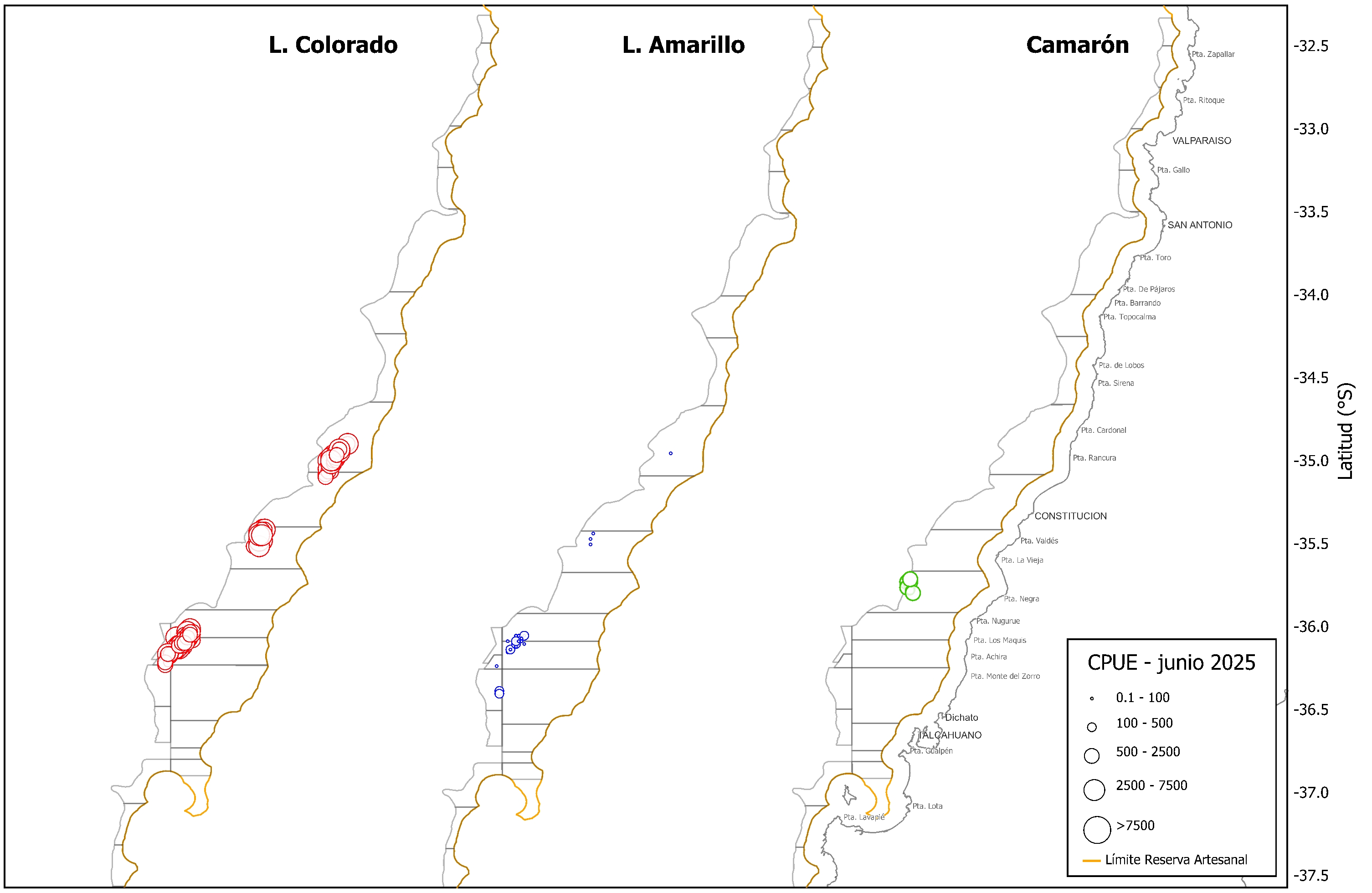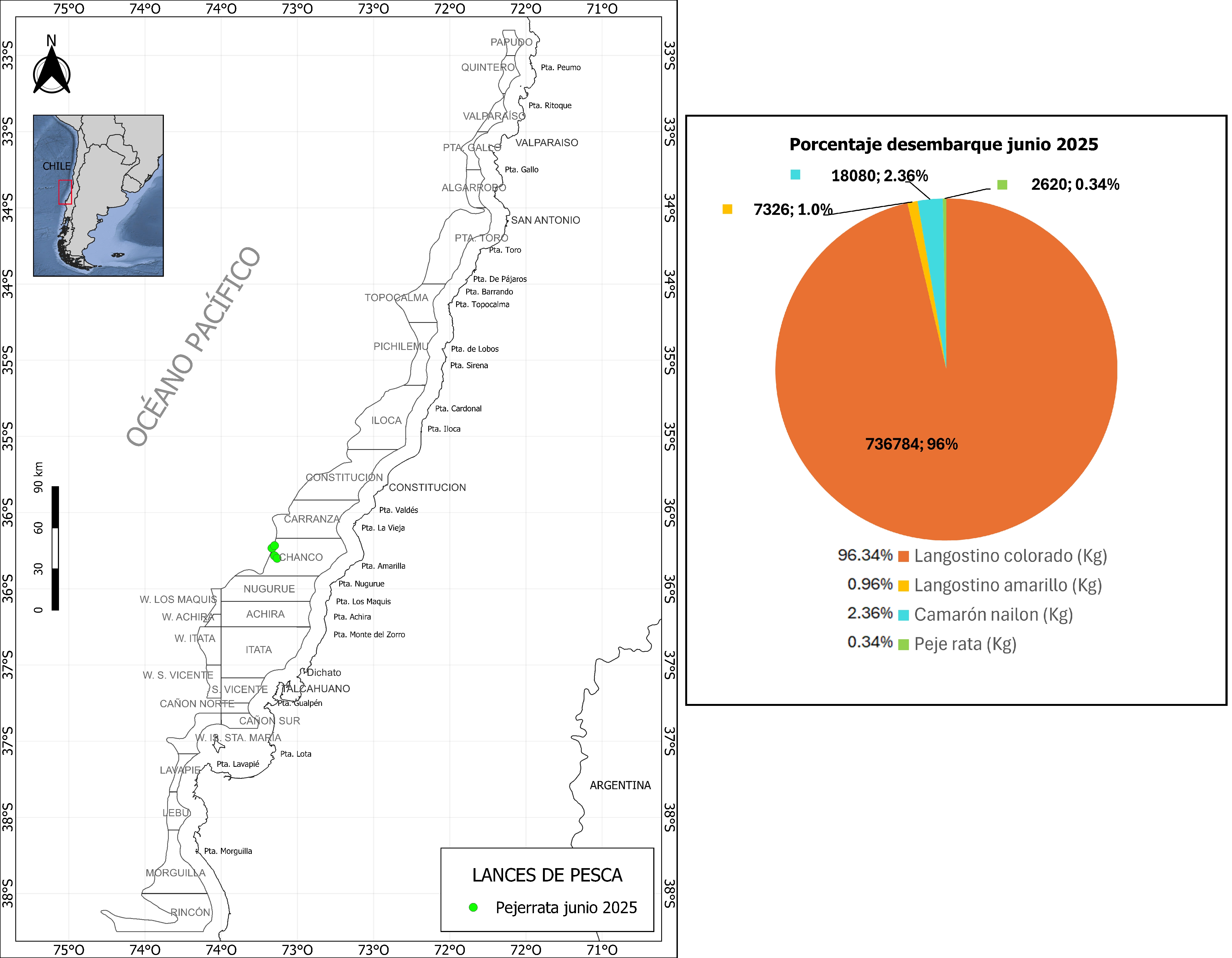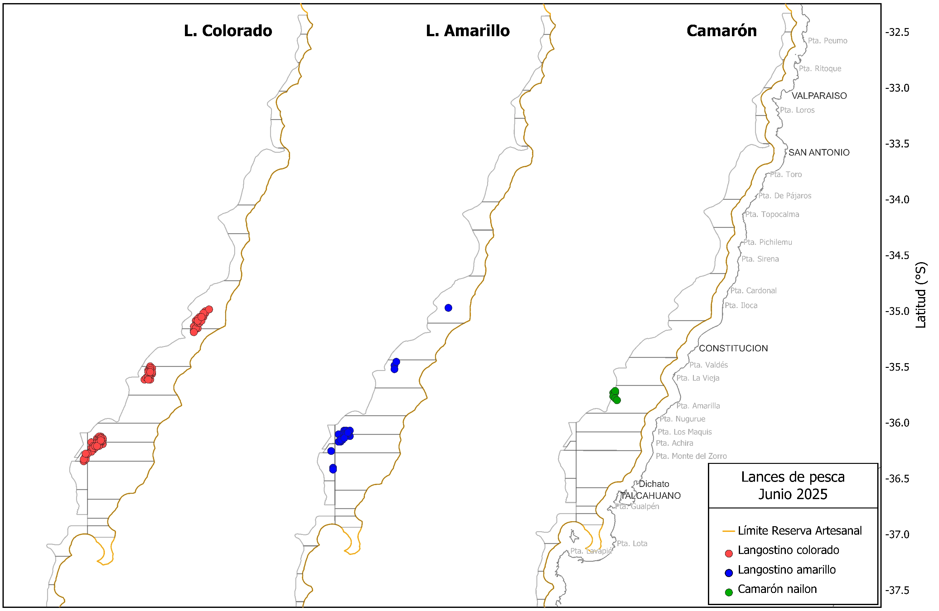 Durante junio de 2025, las operaciones de pesca se realizaron entre las regiones del Biobío y el Maule, destacándose los caladeros de Iloca, Constitución, Carranza, Chanco, Nugurue y Achira. El esfuerzo pesquero estuvo principalmente dirigido al langostino colorado (95 % de los lances) de los cuales el 20 % correspondio a capturas mixtas junto a langostino amarillo y el 75% fue exclusivo de langostino colorado, el otro 3% correspondio a una captura exclusiva de camarón nailon.