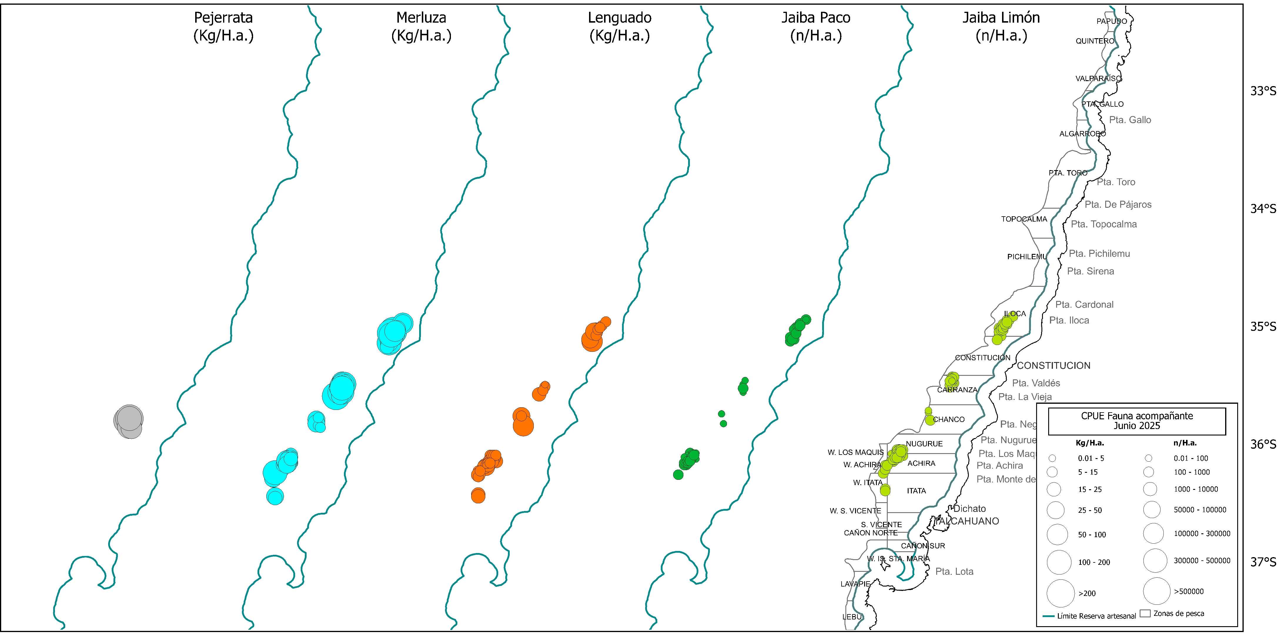 Las operaciones de pesca realizadas durante junio de 2025 por la flota de Crustaceos Pesca Sur evidenciaron la presencia de pejerrata, como fauna acompañante, en el caladero de Chanco (Fig. 14). Esta especie representó solo el 0.34 % del total de las capturas alcanzando un volumen de 2 toneladas.