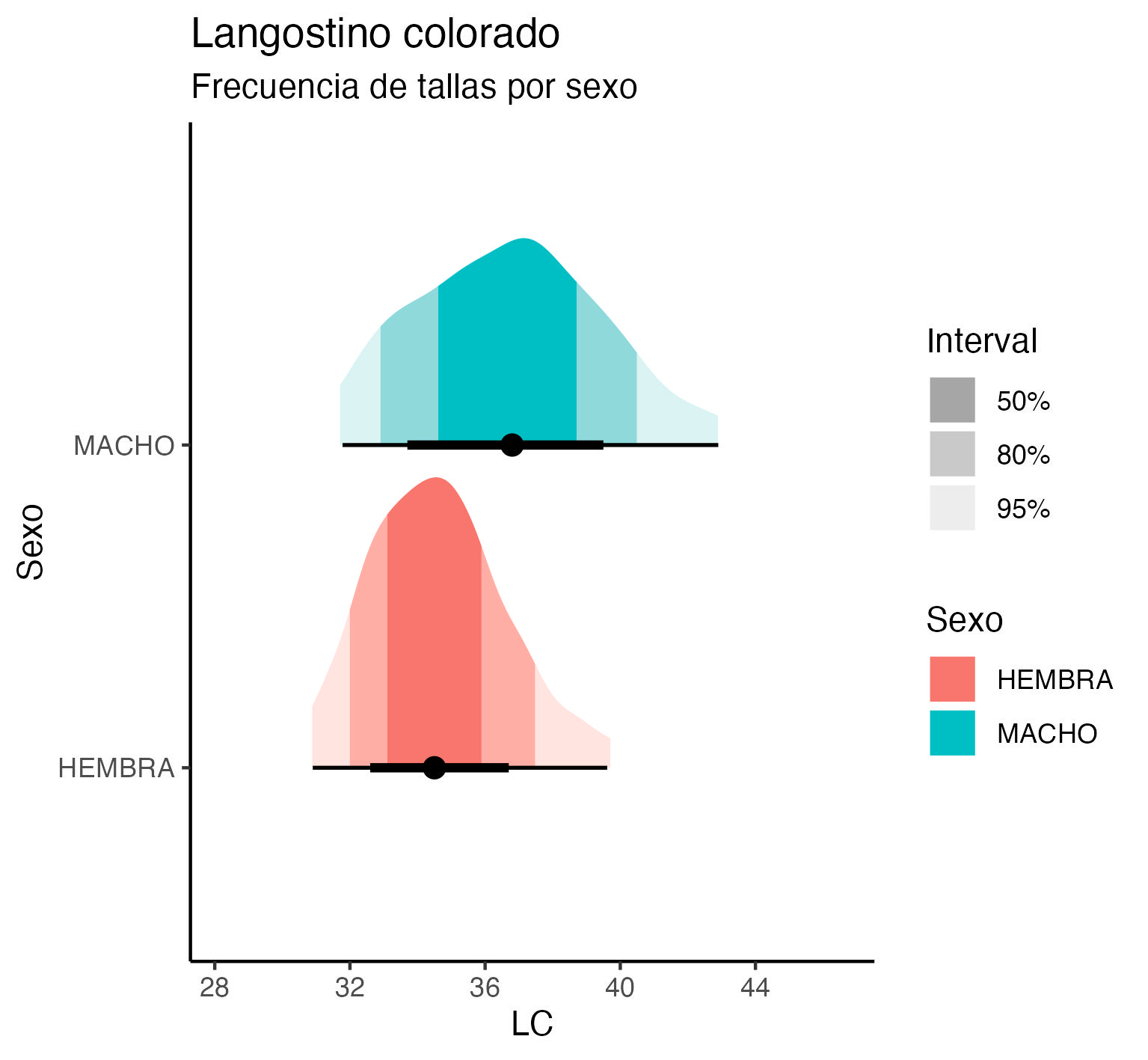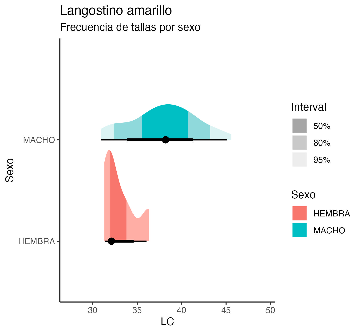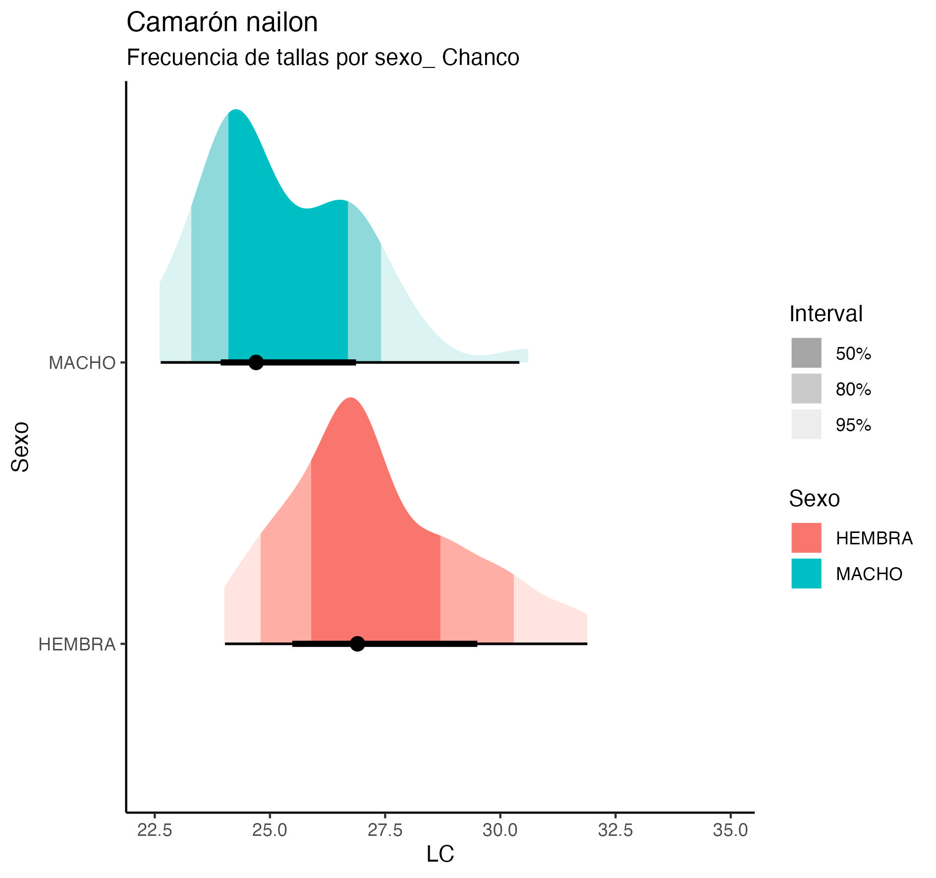 El análisis de tallas del langostino colorado, langostino amarillo y camarón nailon mostró diferencias significativas entre sexos (prueba t de Student, p < 0,05). En el langostino colorado, los machos alcanzaron una talla media de 37 mm LC, mayor que la de las hembras, que fue de 35 mm LC (Fig. 10). De manera similar, en el langostino amarillo los machos presentaron un promedio de 37 mm LC, mientras que las hembras alcanzaron 33 mm LC (Tabla 2, Fig. 11). En cambio, en el camarón nailon las hembras registraron las mayores tallas promedio, superando a los machos (Tabla 2, Fig. 12).