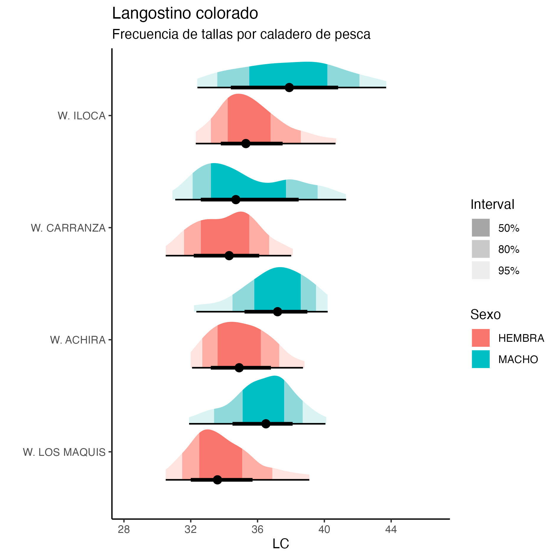 En cuanto a la composición de tallas por zona de pesca, el langostino colorado presentó las tallas modales más pequeñas en el caladero de Los Maquis, mientras que las tallas más grandes se registraron en las zonas al oeste de Iloca y Carranza (Fig. 13). Para el langostino amarillo y el camarón nailon no fue posible realizar este análisis por caladero, debido al escaso número de hembras muestreadas en el caso del langostino amarillo, y a que las muestras biológicas de camarón nailon provinieron únicamente del caladero de Chanco.