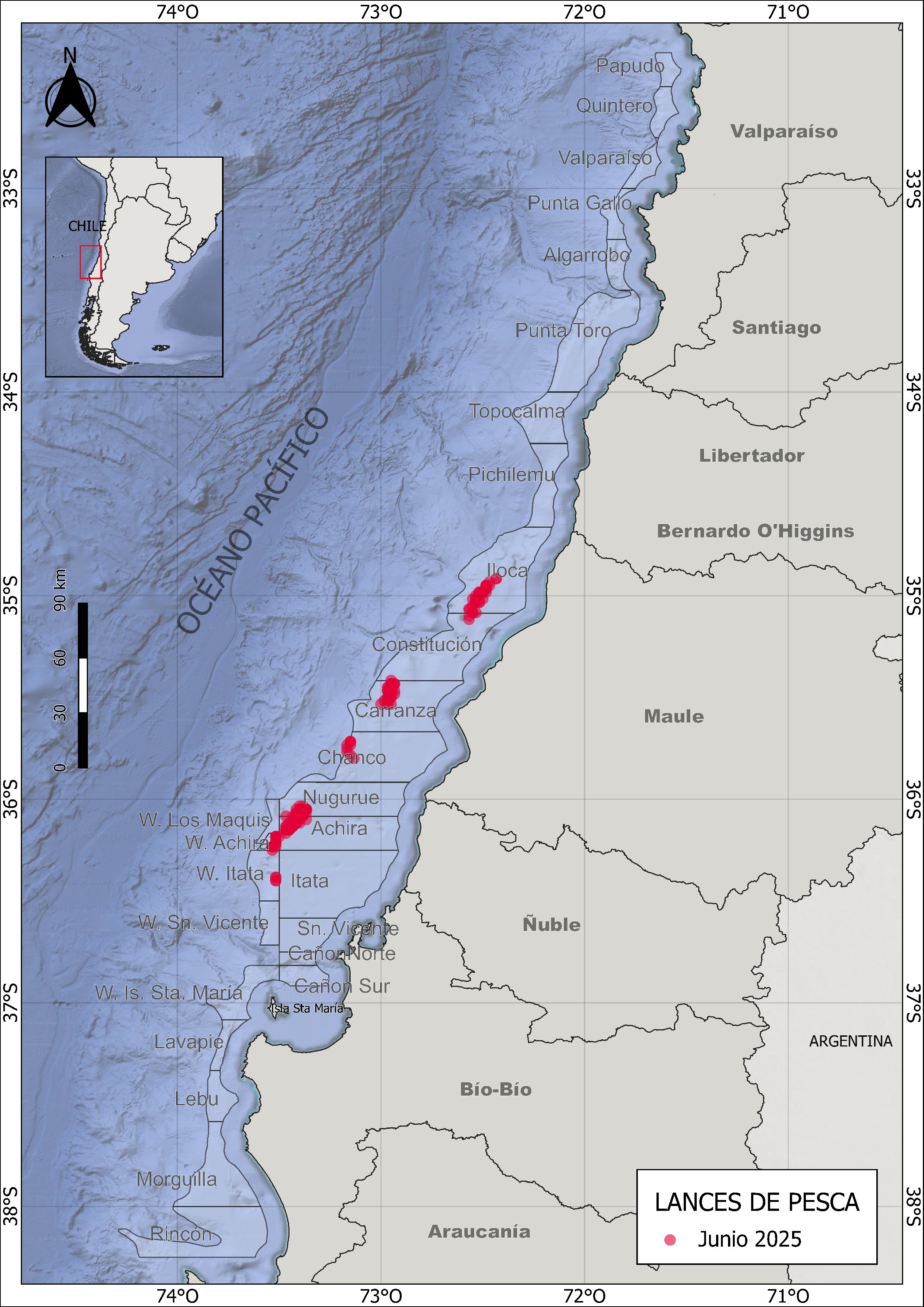 Las operaciones de pesca realizadas durante junio cubrieron los caladeros ubicados desde la región del Bío-Bío a la región de Maule, destacando los caladeros del oeste Iloca, Constitución, Carranza, Achira y el oeste de la isla Sta. María (Fig. 1).