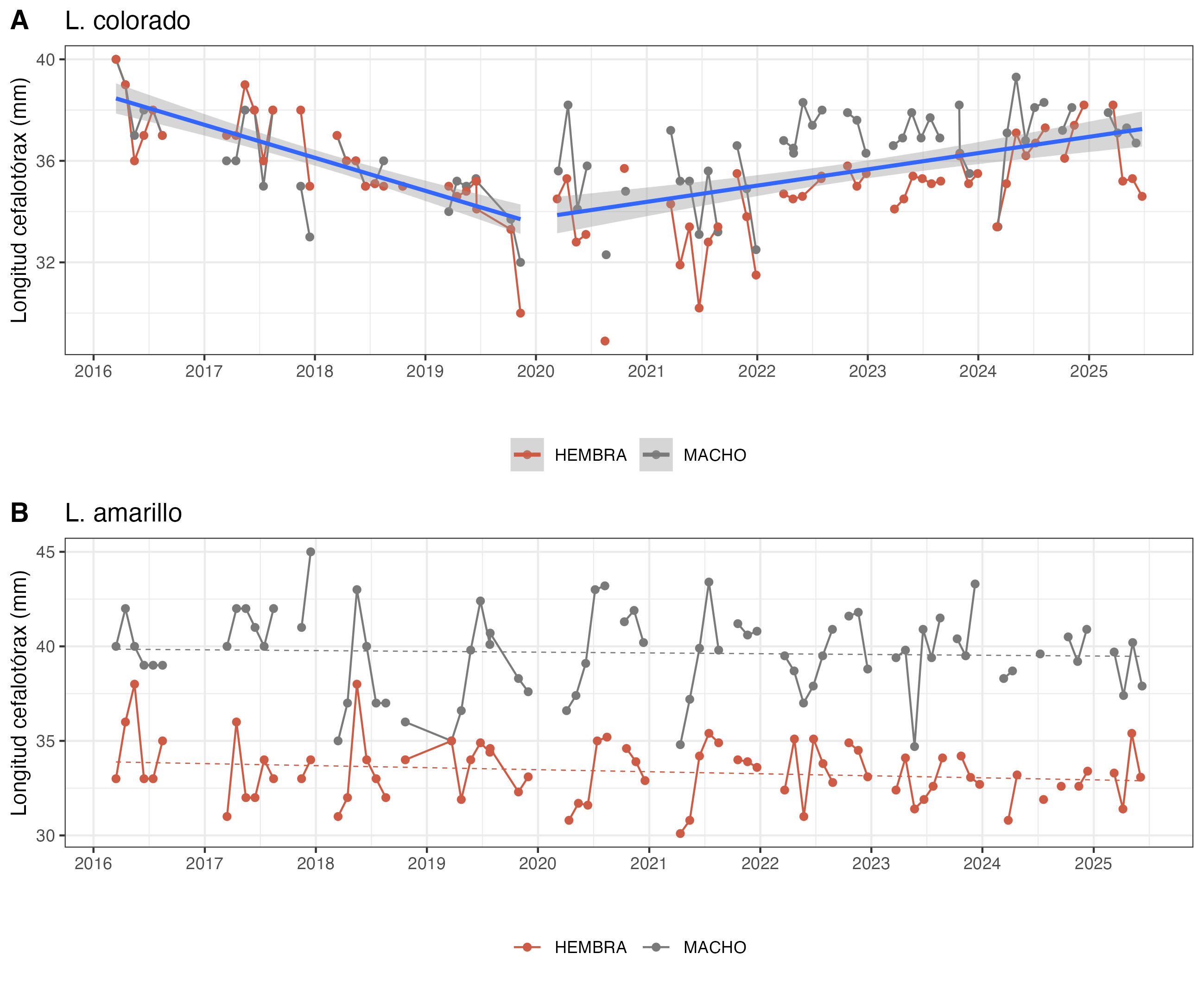 En cuanto a las tallas promedio, el langostino colorado presentó longitudes cefalotorácicas entre 28 y 47 mm, con promedios de 36,7 mm en machos y 34,6 mm en hembras. En comparación con temporadas anteriores, las tallas medias al inicio de este año fueron particularmente altas, superando los 37 mm LC; sin embargo, durante junio se observó un descenso marcado en ambos sexos (Fig. 8). En el caso del langostino amarillo, los machos alcanzaron una talla promedio de 37,9 mm LC, superior a la registrada en hembras, que fue de 33,1 mm LC (Tabla 2, Fig. 8). Por su parte, en el camarón nailon, las hembras destacaron por presentar las mayores tallas promedio, con 27,3 mm LC, frente a los 25 mm observados en los machos.