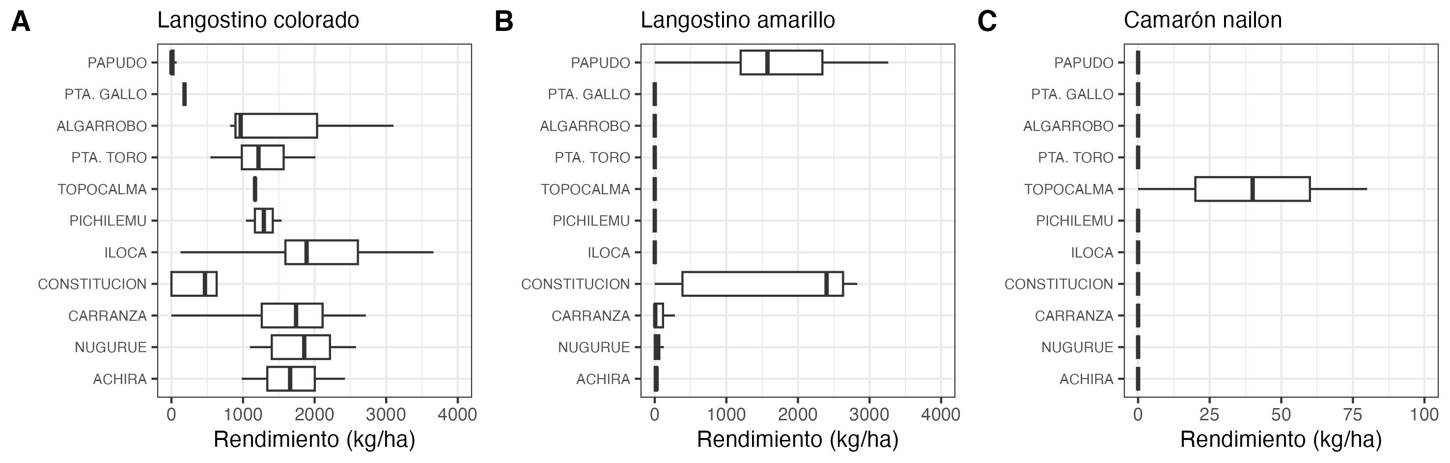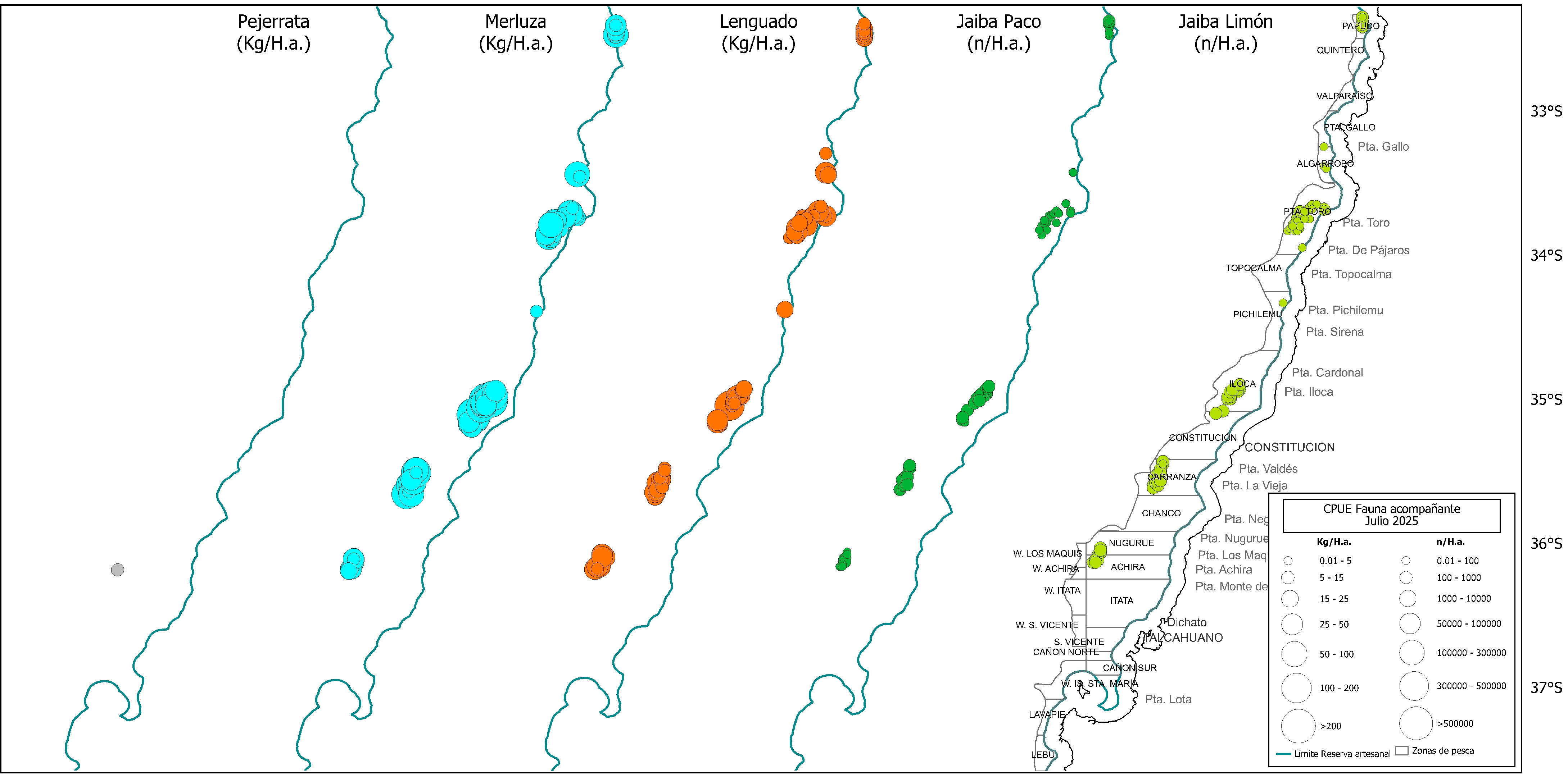 En cuanto a la distribución espacial del rendimiento de pesca durante julio, destacaron los caladeros de Iloca y Carranza por sus altos rendimientos de langostino colorado, con promedios entre 1500 y 2500 kg/ha (Fig. 4 y 5). En el caso del camarón nailon, las capturas se concentraron exclusivamente en el caladero de Topocalma, con rendimientos entre 25 y 60 kg/ha. Para el langostino amarillo, los mayores rendimientos se observaron en Papudo y Constitución, con valores entre 500 y 2500 kg/ha (Fig. 4 y 5).