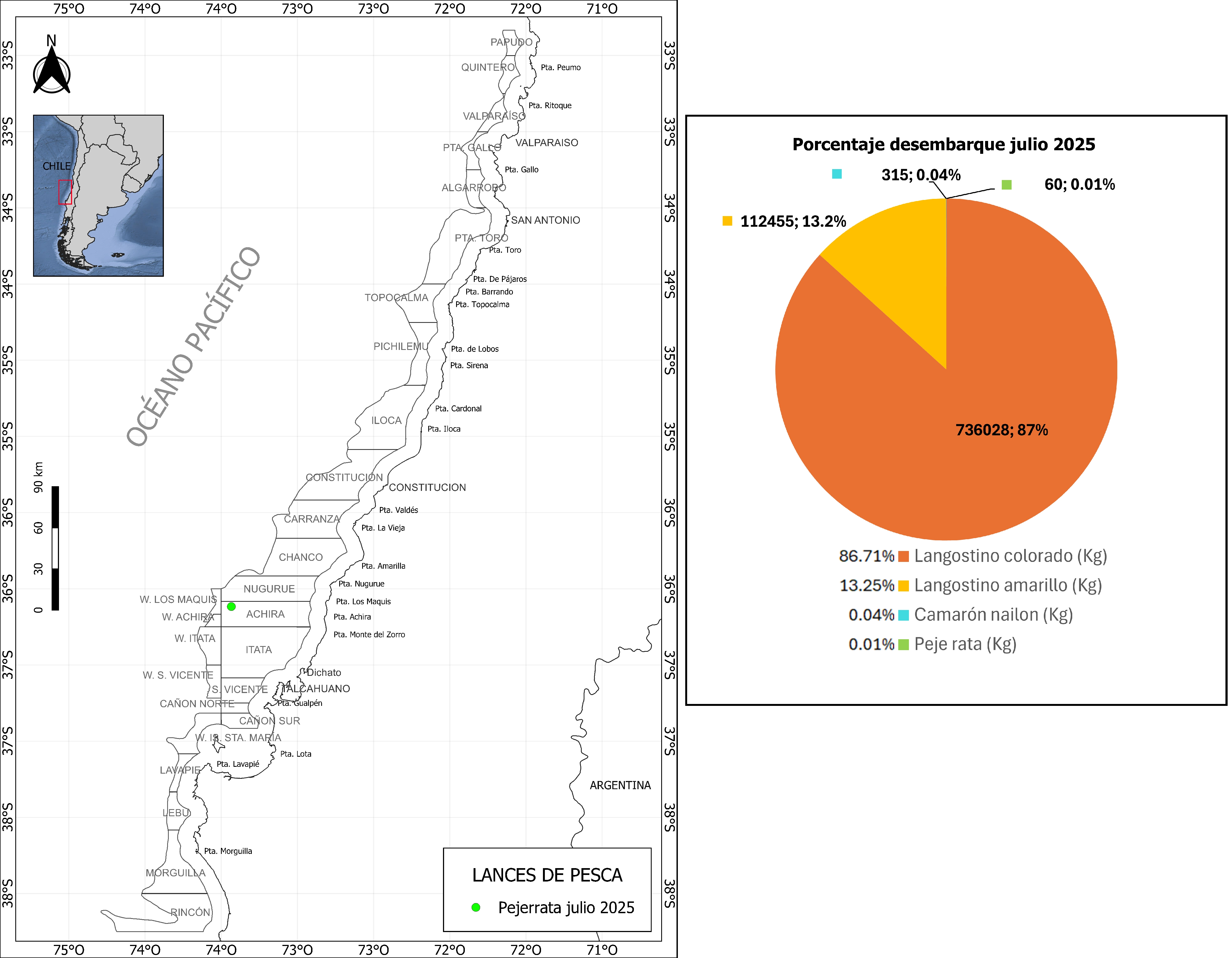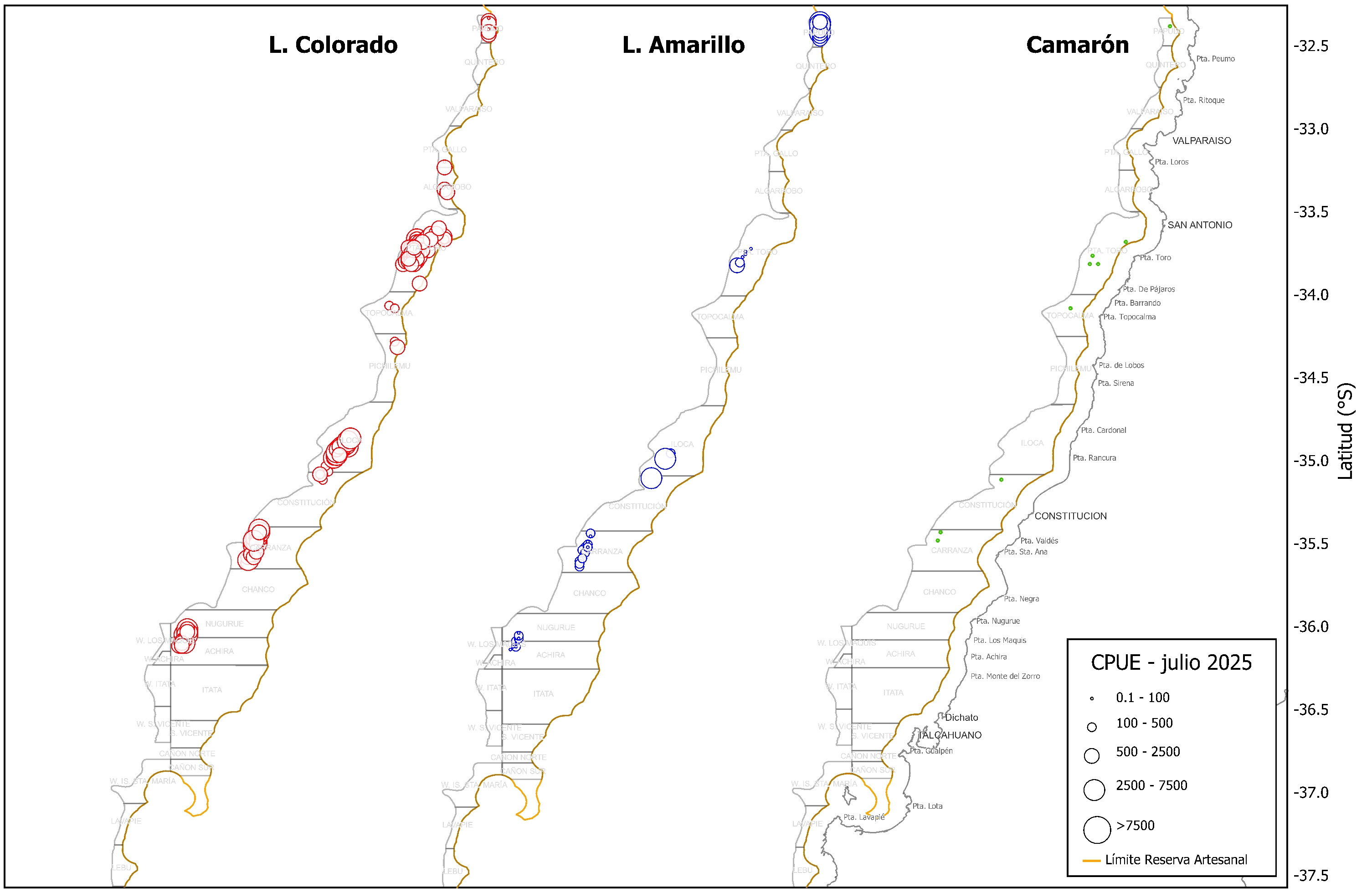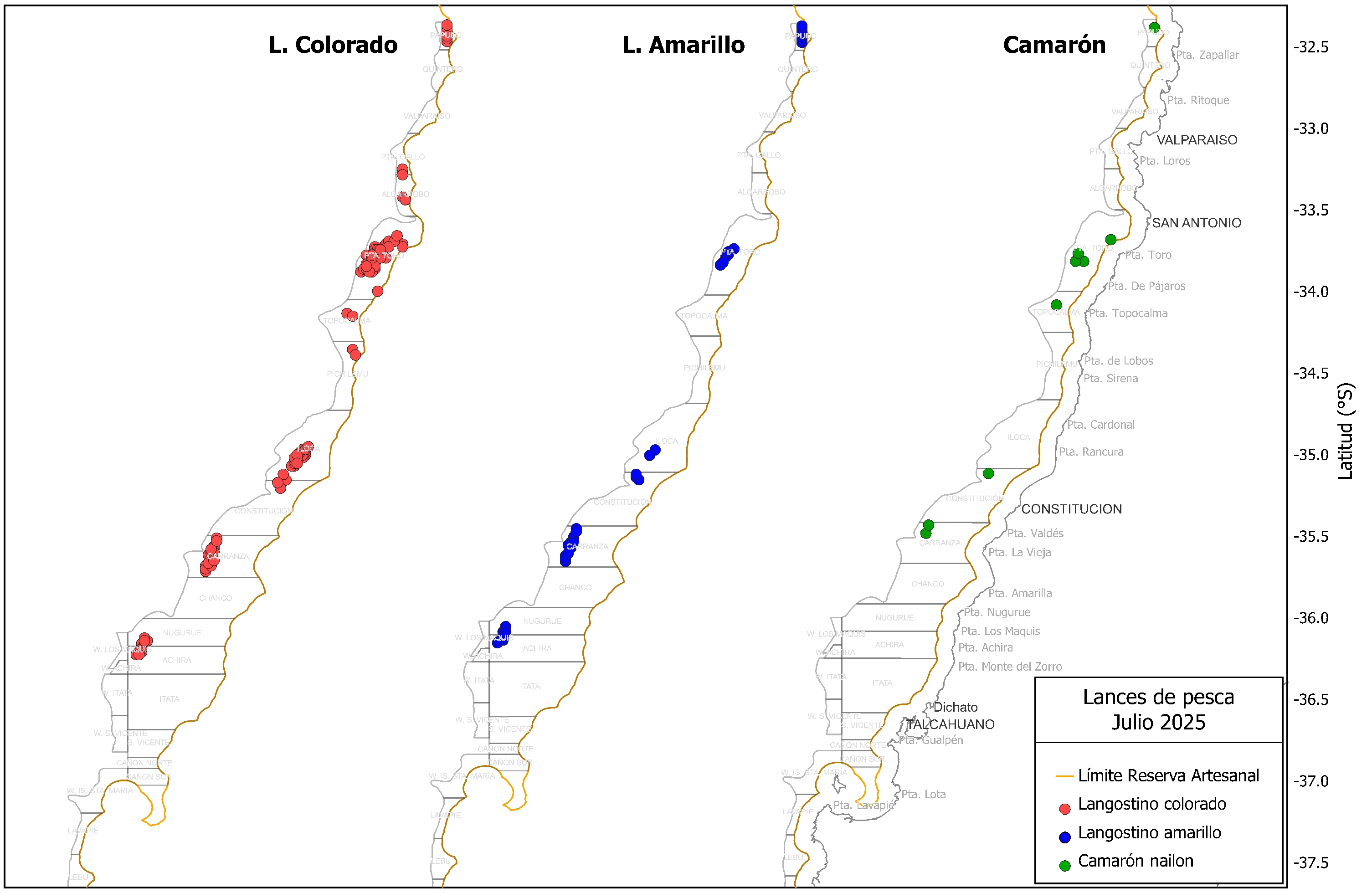 Durante julio de 2025, la flota arrastrera de Camanchaca Pesca Sur operó entre las regiones de Ñuble y Valparaíso, concentrando sus actividades en los caladeros de Punta Toro, Iloca y Carranza. La pesquería se dirigió principalmente al langostino colorado, con la mayor parte de los lances orientados exclusivamente a este recurso y el resto distribuido en capturas mixtas con langostino amarillo y, en menor medida, camarón nailon. El langostino colorado alcanzó las mayores capturas y rendimientos, mientras que el langostino amarillo mostró rendimientos intermedios y el camarón nailon una participación acotada en las capturas totales.
