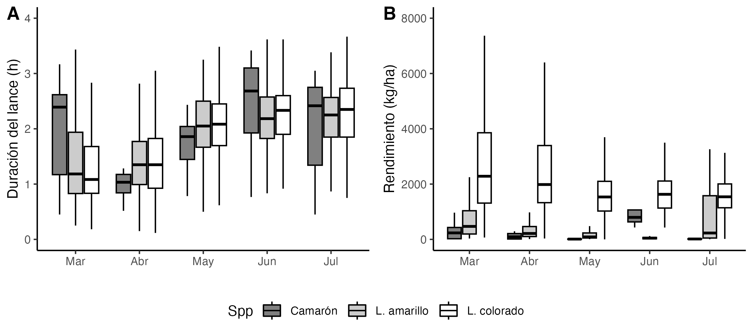 El rendimiento de pesca del langostino colorado osciló entre 17 y 5520 kg/ha, con una moda de 1562 kg/ha. El esfuerzo por lance varió entre 14 y 1441 minutos, concentrándose mayoritariamente en torno a 2 horas y 20 minutos (Fig. 3). En el caso del langostino amarillo, el rendimiento fluctuó entre 6 y 3261 kg/ha, con un esfuerzo predominante cercano a 2 horas y 13 minutos. Por su parte, el camarón nailon alcanzó un rendimiento máximo de 80 kg/ha, concentrando su esfuerzo principalmente en torno a 2 horas y 26 minutos (Fig. 3).