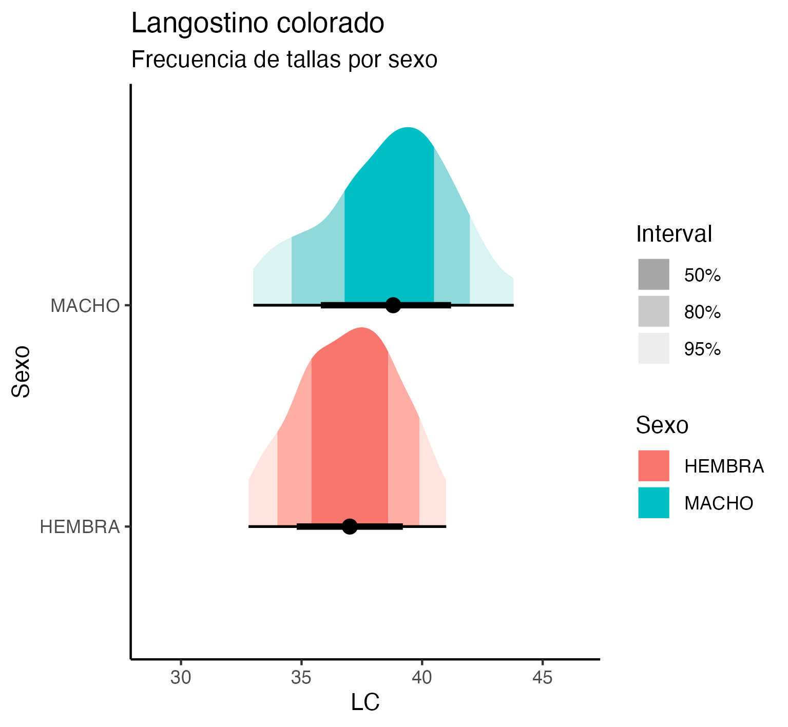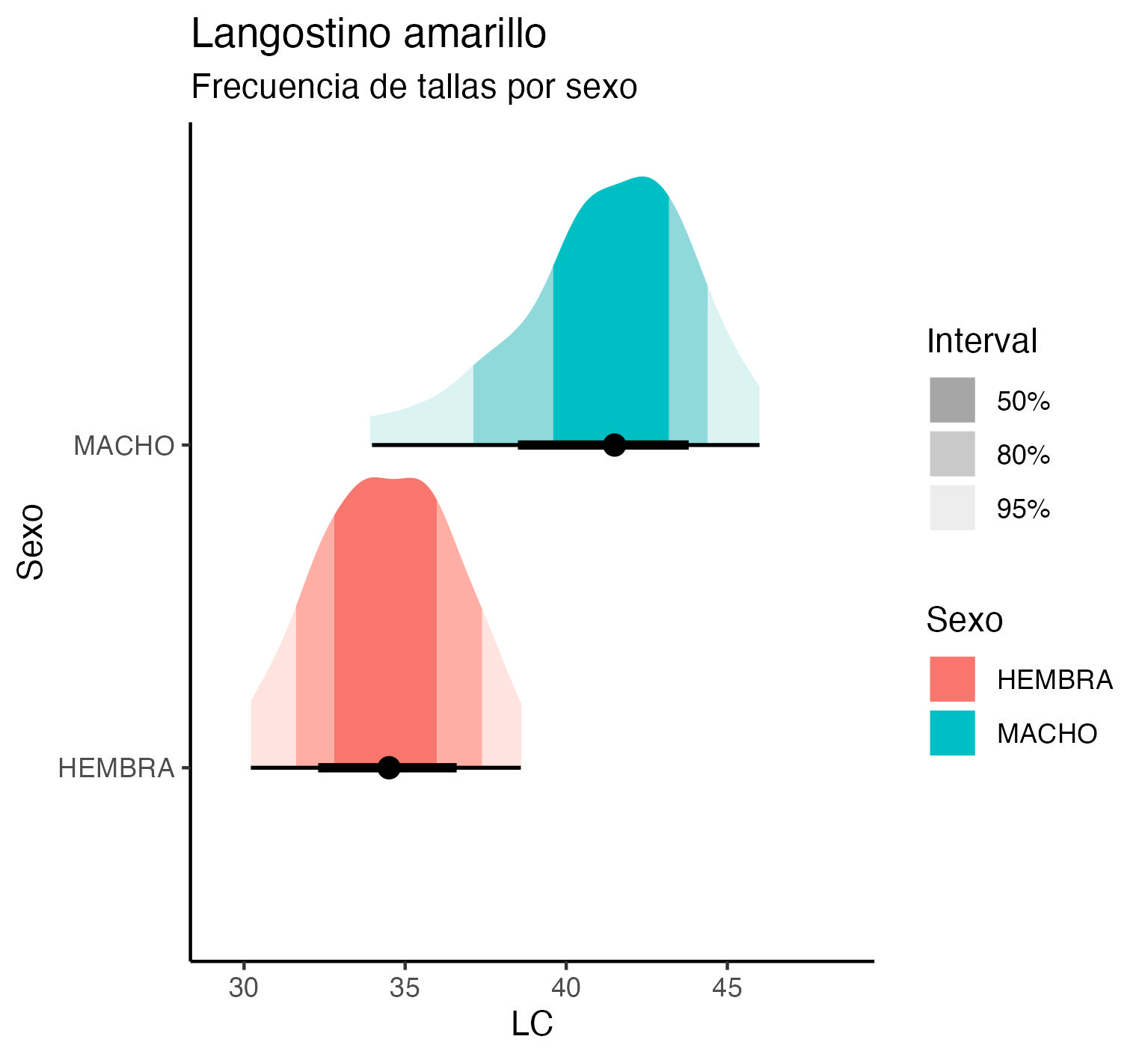 El análisis de tallas del langostino colorado, langostino amarillo y camarón nailon mostró diferencias significativas entre sexos (prueba t de Student, p < 0,05). En el langostino colorado, los machos alcanzaron una talla media de 38 mm LC, mayor que la de las hembras, que fue de 36 mm LC (Fig. 9). De manera similar, en el langostino amarillo los machos presentaron un promedio de 41 mm LC, mientras que las hembras alcanzaron 34 mm LC (Tabla 2, Fig. 10).