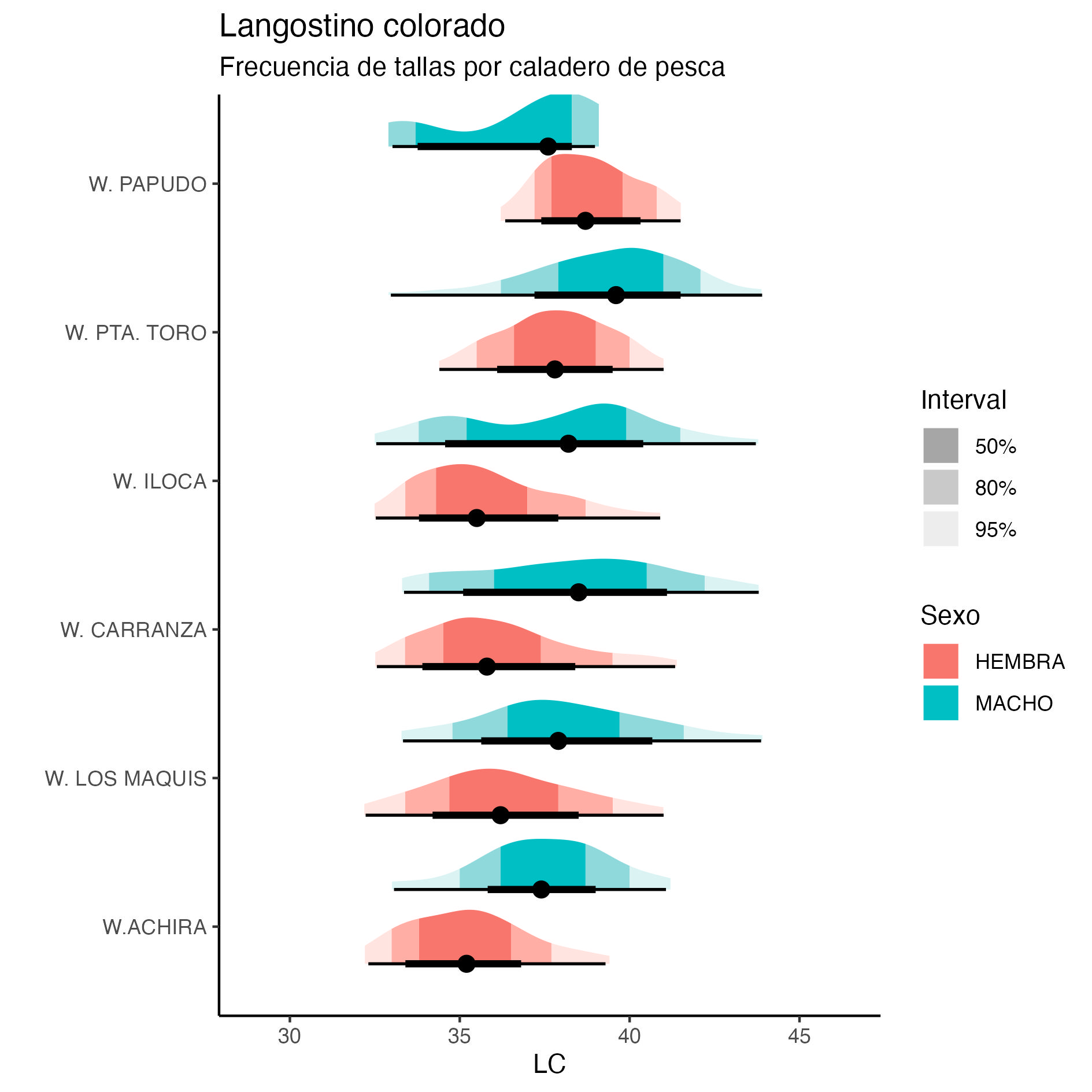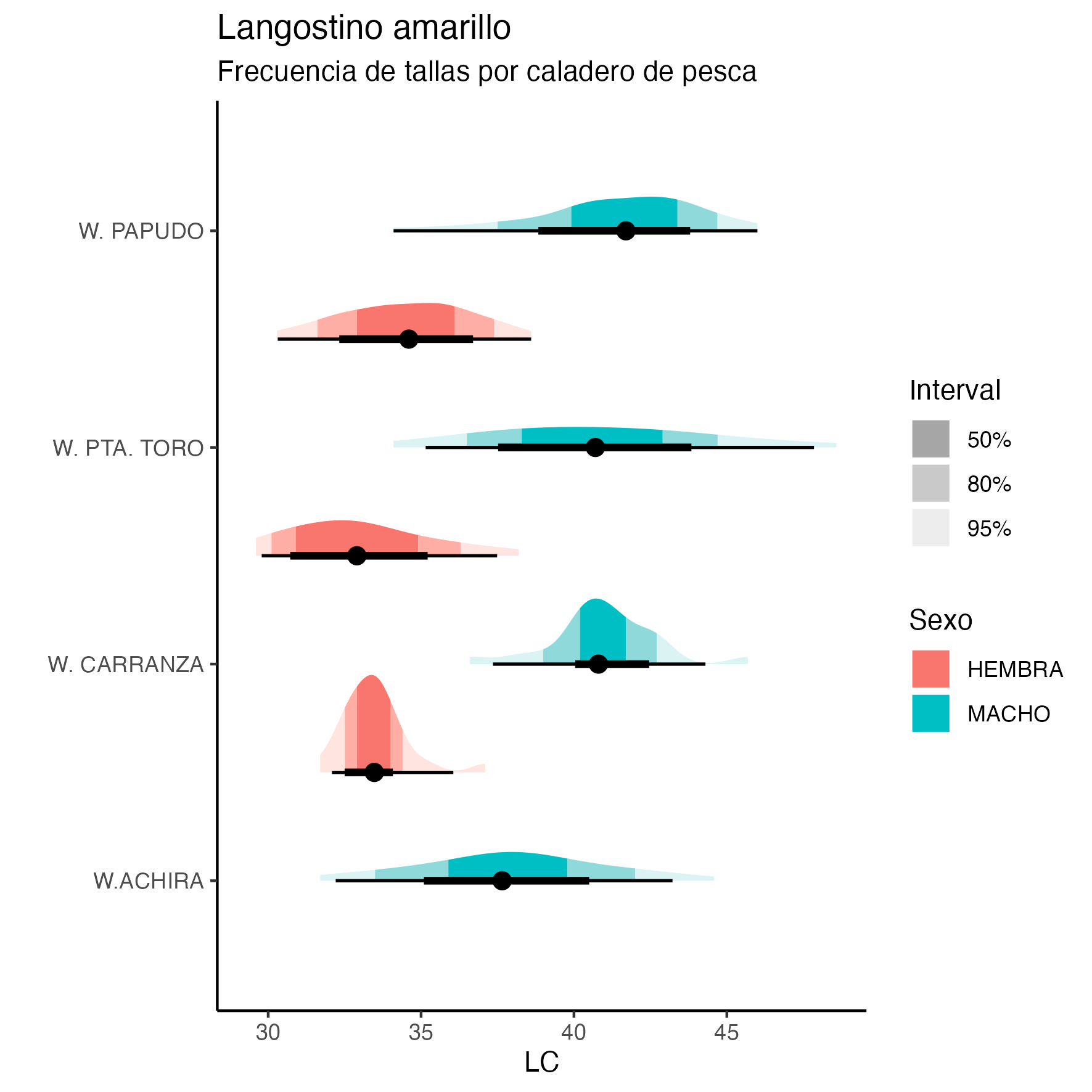 En cuanto a la composición de tallas por zona de pesca, el langostino colorado presentó las tallas modales más pequeñas en el caladero de Achira, mientras que las tallas más grandes se registraron en las zonas al oeste de Iloca y Carranza (Fig. 11). Para el langostino amarillo, los caladeros de Punta Toro y Papudo destacaron por presentar las mayores tallas en machos, mientras que en el caso de las hembras las tallas más altas se observaron en Papudo (Fi.12).