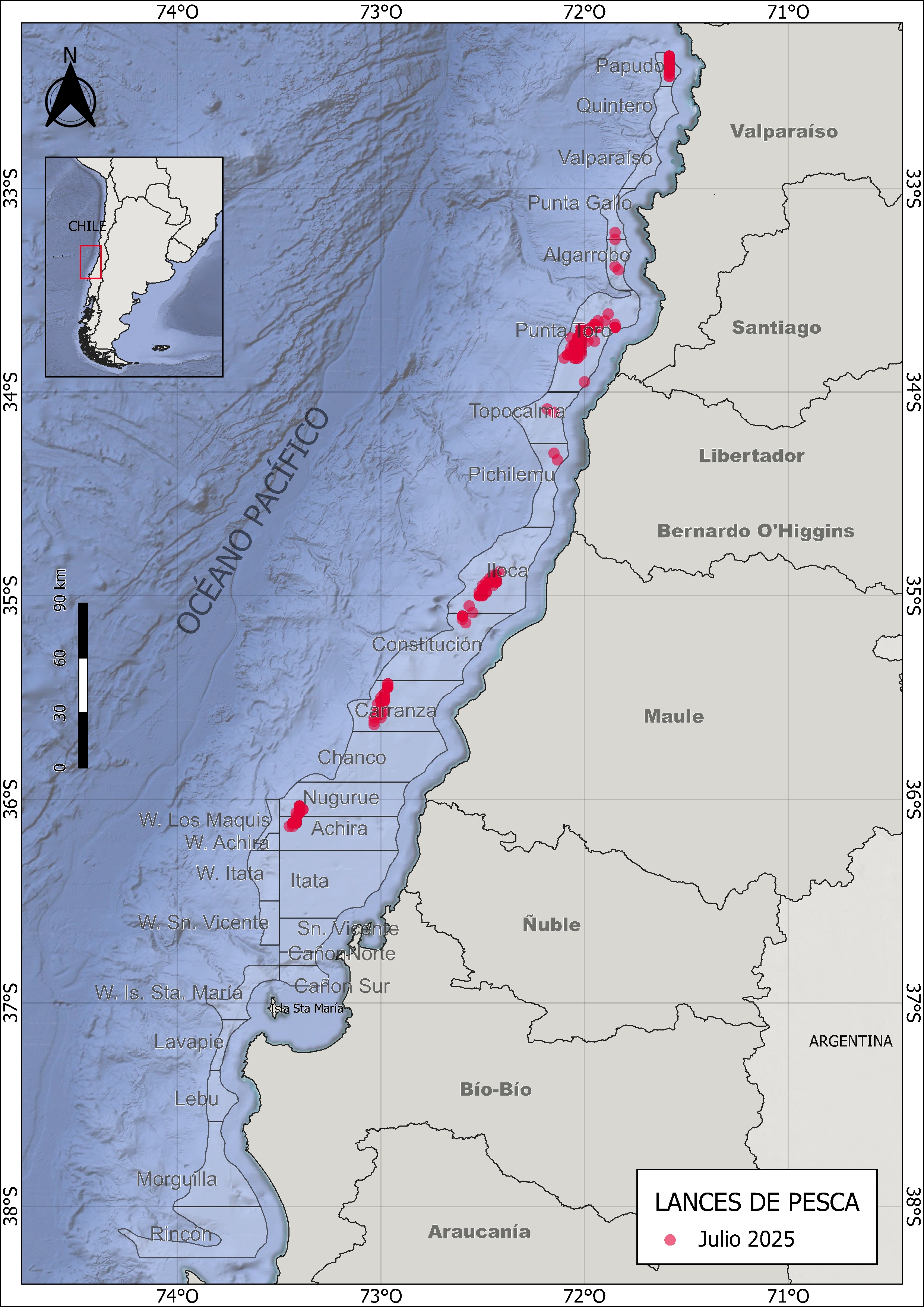 Las operaciones de pesca realizadas durante julio cubrieron los caladeros ubicados desde la región del Ñuble a la región de Valparaíso, destacando los caladeros de Punta Toro, Iloca y Carranza (Fig. 1).